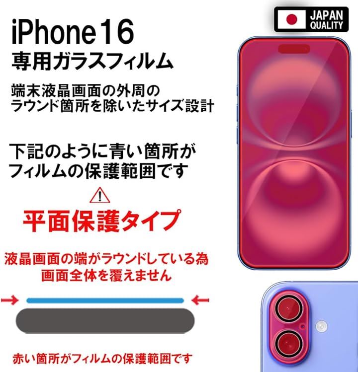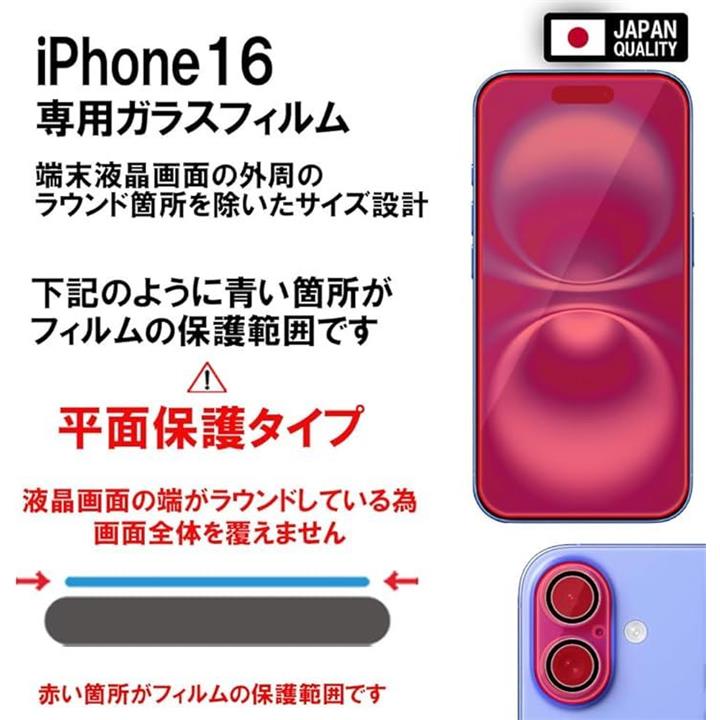 RISE 2枚+2枚 フィルム iPhone 16 ガラスフィルム カメラフィルム レンズフィルム レンズ保護ガラス レンズカバー 保護フィルム 強化 高透過 高光沢 日本製 旭硝子 0.26mm 硬度10H 2.5Dラウンドエッジ 自動吸着 気泡ゼロ 飛散防止