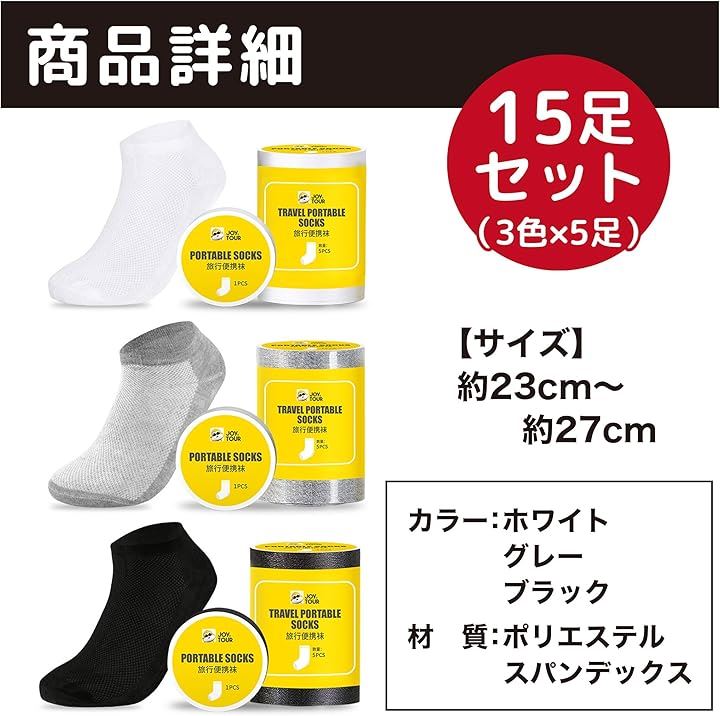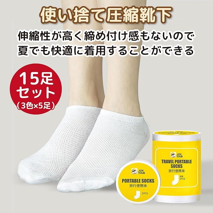 Edison Brain 使い捨て 圧縮 靴下 23-27cm 15足セット 3色 ショート アンクル ソックス 軽量 コンパクト 防災 旅行 入院 キャンプ
