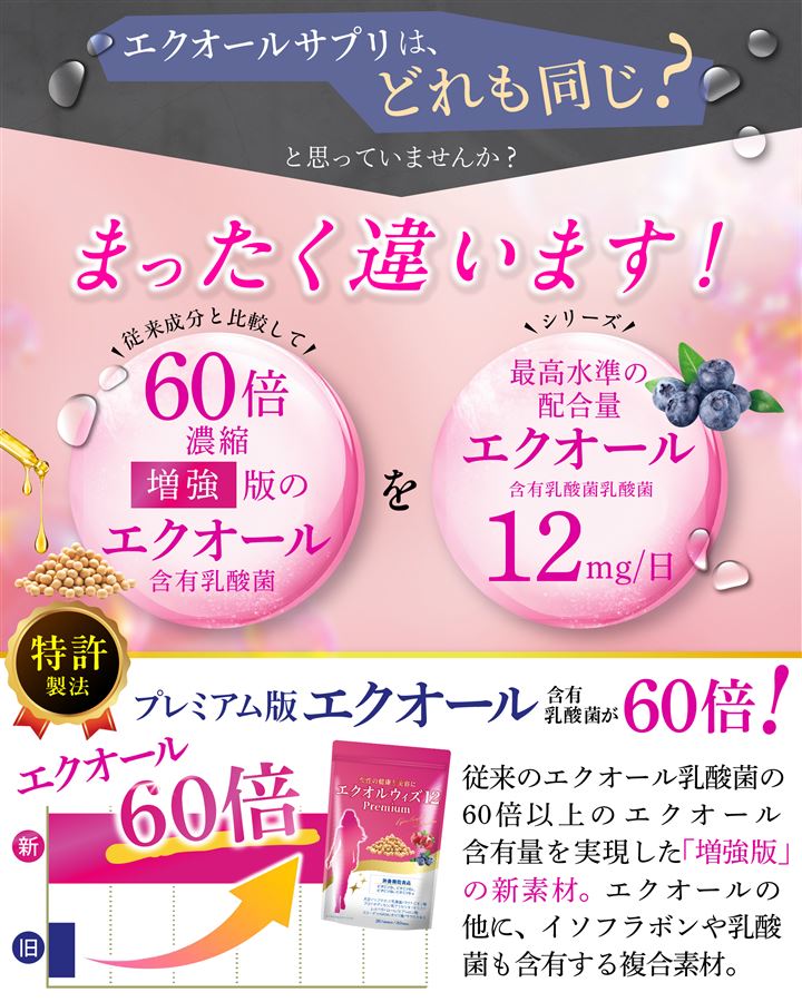 「60倍エクオールパワー」エクオルウィズ12は「プレミアム版」エクオール乳酸菌を配合したサプリメント(同成分従来品とエクオール含有規格を比較)