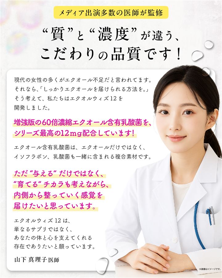 「医師監修」えくおーる乳酸菌やアグリコン型イソフラボンなど、若々しい毎日をサポートする成分をバランスよく配合したサプリ