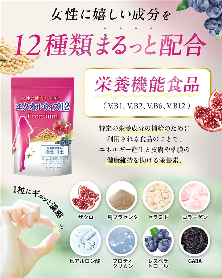 「原材料名」難消化性デキストリン(国内製造)、大豆抽出物、エクオール乳酸菌発酵エキス含有粉末(乳酸菌発酵エキス(黒糖・大豆胚芽培地、乳酸菌)、梅エキス、デキストリン、海洋深層水)(大豆を含む)、乳酸菌末(乳酸菌(殺菌)、デキストリン)(乳成分を含む)、乳糖発酵物(乳糖発酵液、乳糖)(乳成分を含む)、殺菌乳酸菌混合末(デキストリン、乳酸菌混合末、乳糖)(乳成分・大豆を含む)、イソマルトオリゴ糖、イヌリン、プロテオグリカン含有サケ鼻軟骨抽出物(デキストリン、サケ鼻軟骨抽出物)(サケを含む)、鶏軟骨抽出物(ゼラチンを含む)、ザクロ果汁粉末(デキストリン、ザクロ果汁)、レスベラトロール含有赤ワインエキス末、馬プラセンタエキス末/セルロース、ステアリン酸カルシウム、微粒酸化ケイ素、ビタミンB2、ビタミンB6、ビタミンB1、ヒアルロン酸、ビタミンB12