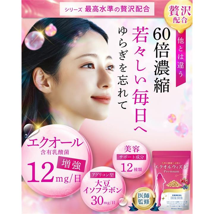 60倍パワーエクオルウィズ12 エクオール 乳酸菌 サプリメント 30日分 えくおーる サプリ イソフラボン 国内製造 ビタミンB12 |