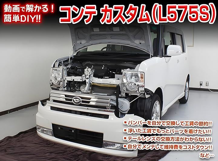・ルームランプ交換方法、ライト交換方法・ フロント(リア)バンパー交換方法・内張り交換方法などなど、コンテ カスタム(L575S) の 各種パーツの取外し方法や取付け方法、改造やチューニングを解説したDVD。