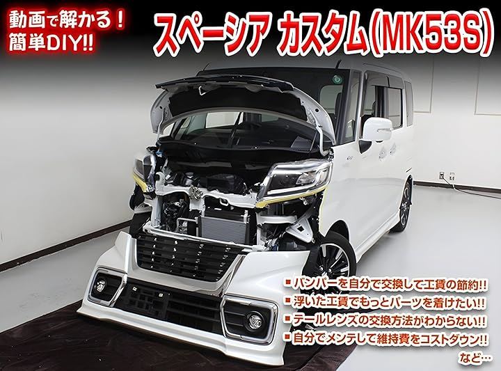 スペーシア カスタム MK53S メンテナンスオールインワンDVD 内装・外装セット ・ルームランプ交換方法、ライト交換方法・ フロント(リア)バンパー交換方法・内張り交換方法などなど、スペーシア カスタム MK53S の 各種パーツの取外し方法や取付け方法、改造やチューニングを解説したDVD。