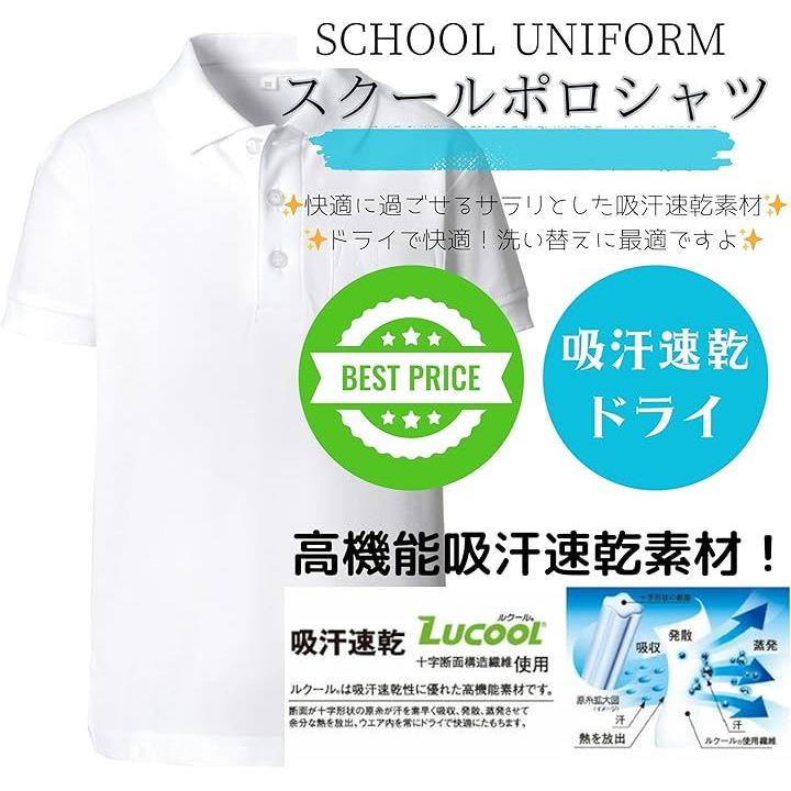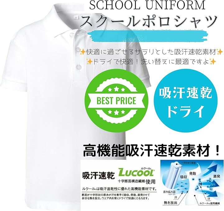 通学や通塾、さらには冠婚葬祭にもぴったりなこのポロシャツは、男の子、女の子、小学生に最適で、ユニセックスなデザインです 「快適な着心地と高機能を両立したポロシャツ」 このスクールポロシャツは、綿100%とポリエステルの鹿の子編み素材を採用し、柔らかな肌触りと抜群の耐久性を実現しています ポリエステル部分には《ドライ》で優れた《吸汗速乾》性能を持つ《機能性素材》「Lucool」を使用しており、汗をかいてもすぐに乾くため、暑い夏の日でも快適さを保てます。