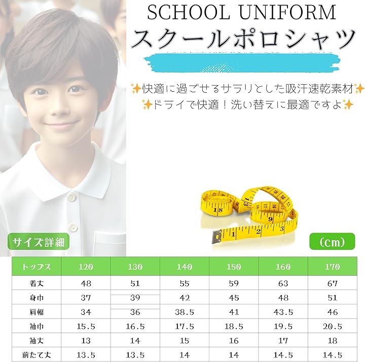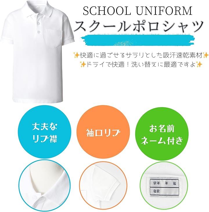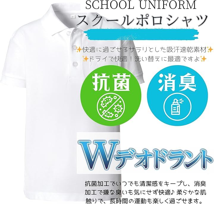 通学や体操着、入学式、フォーマル、冠婚葬祭と多用途に使えるほか、抗菌防臭機能も備えており、より清潔に保つことができます 「通学から特別なシーンまで幅広く対応」 シンプルでありながら高機能なこのポロシャツは、日常の学校生活から特別なイベントまで幅広く対応できるため、非常に便利です。