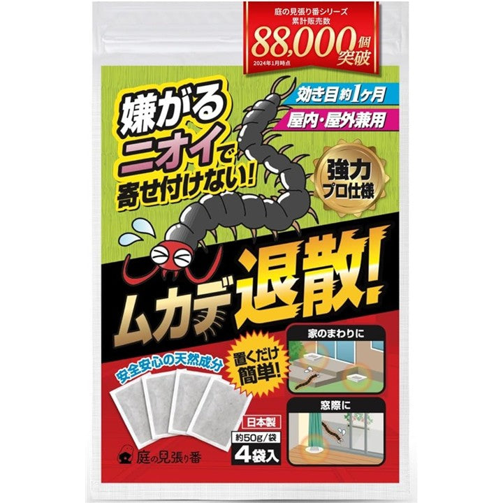 ムカデ退散。 忌避剤 ムカデ対策 百足対策 屋外 屋内兼用強力プロ仕様・天然香料だから安心・置くだけ簡単効き目約1ヶ月・4袋入 4~8m分