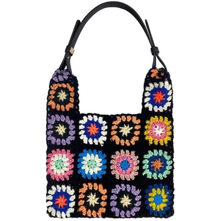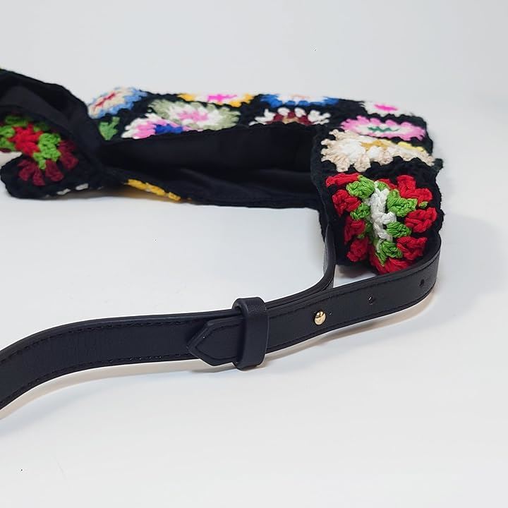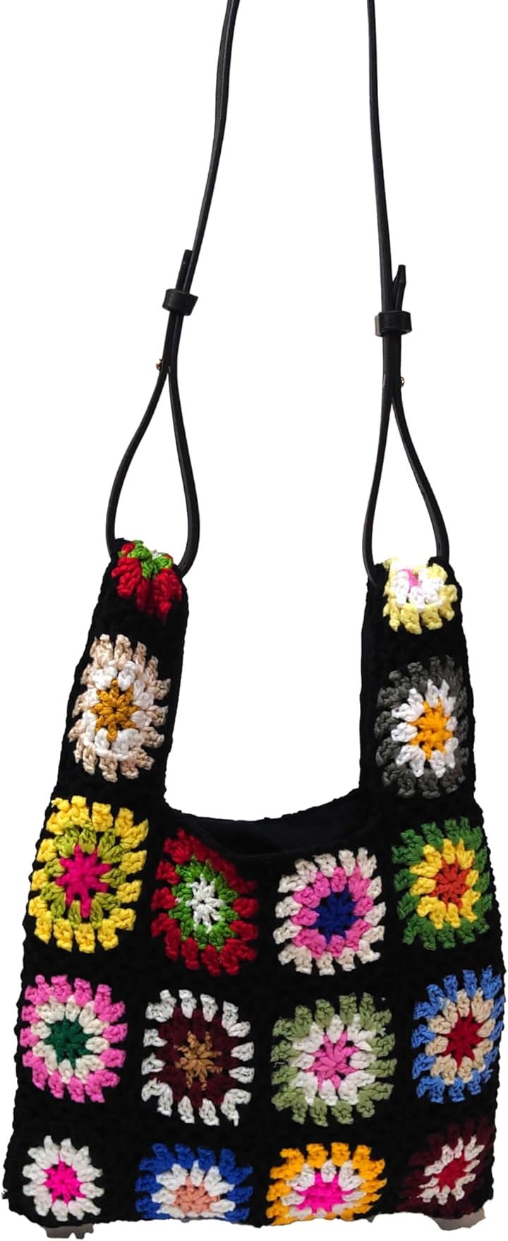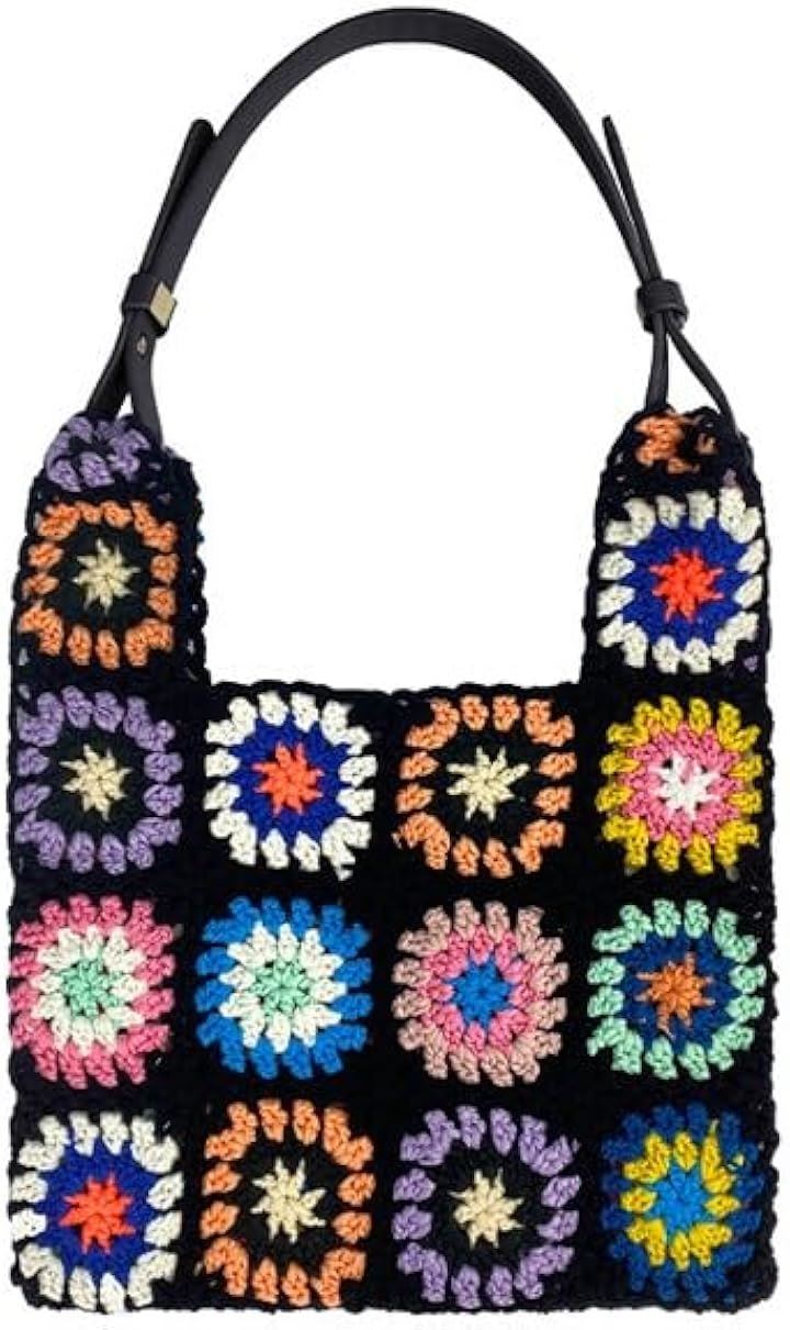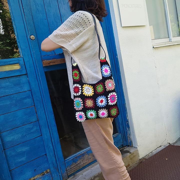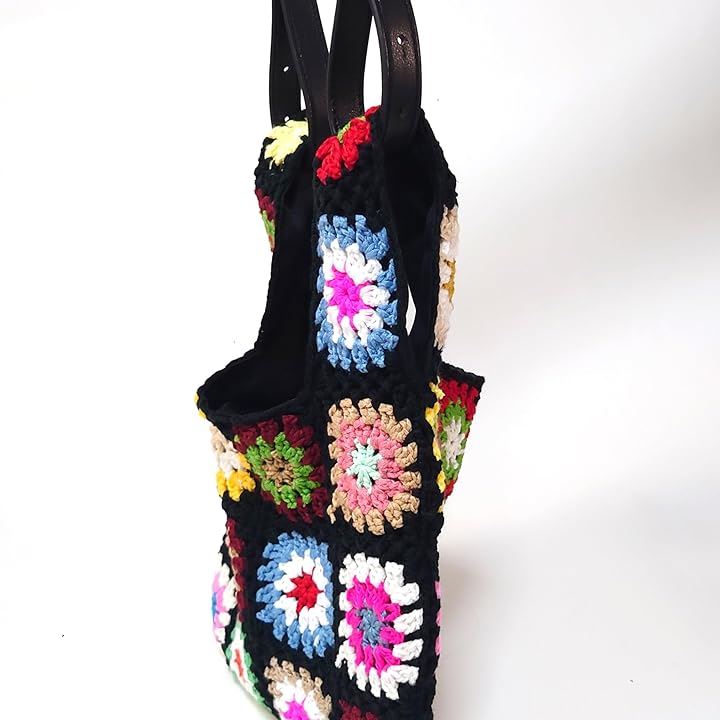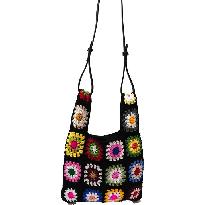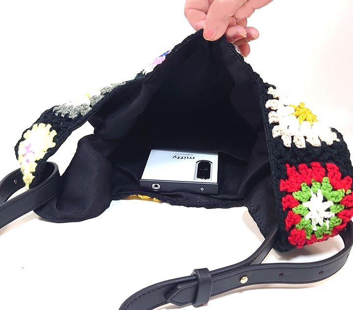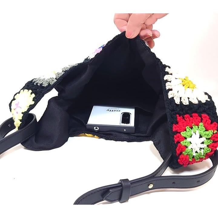 モチーフ編み ニットバッグ 裏地付き かわいい ガーリー ポップ フラワー スマホバッグ ブラック
