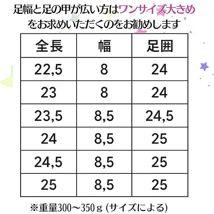 サイズ:22.5 全長:22.5cm 幅:8cm 足囲:24cm/23 全長:23cm 幅:8cm 足囲:24cm/23.5 全長:23.5cm 幅:8.5cm 足囲:24.5cm/24 全長:24cm 幅:8.5cm 足囲:25cm/24.5 全長:24.5cm 幅:8.5cm 足囲:25cm/25 全長:25cm 幅:8.5cm 足囲:25cm *平置き採寸の為、多少の誤差が生じる場合がございます。