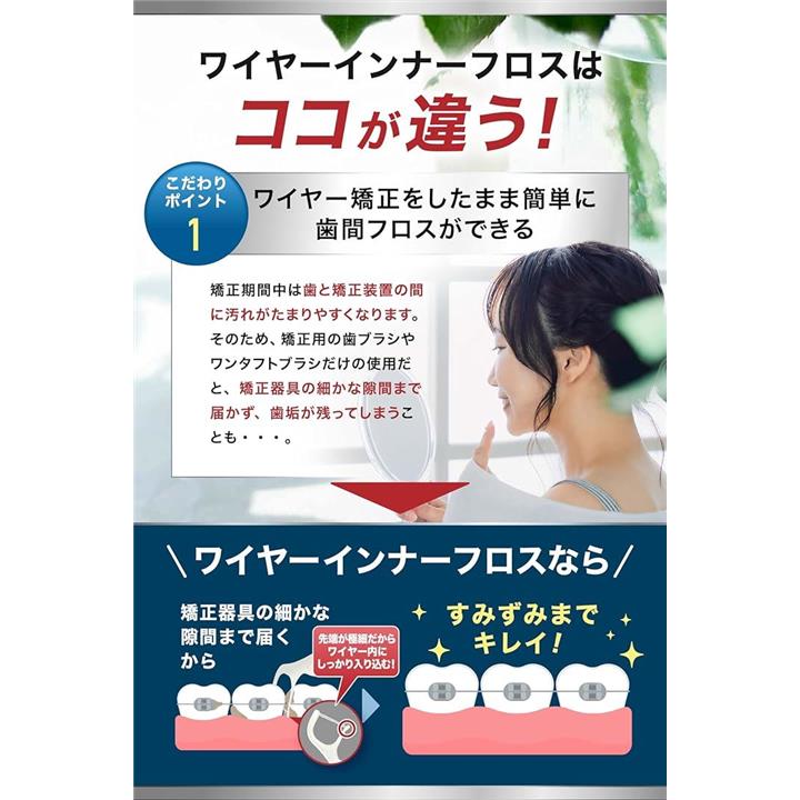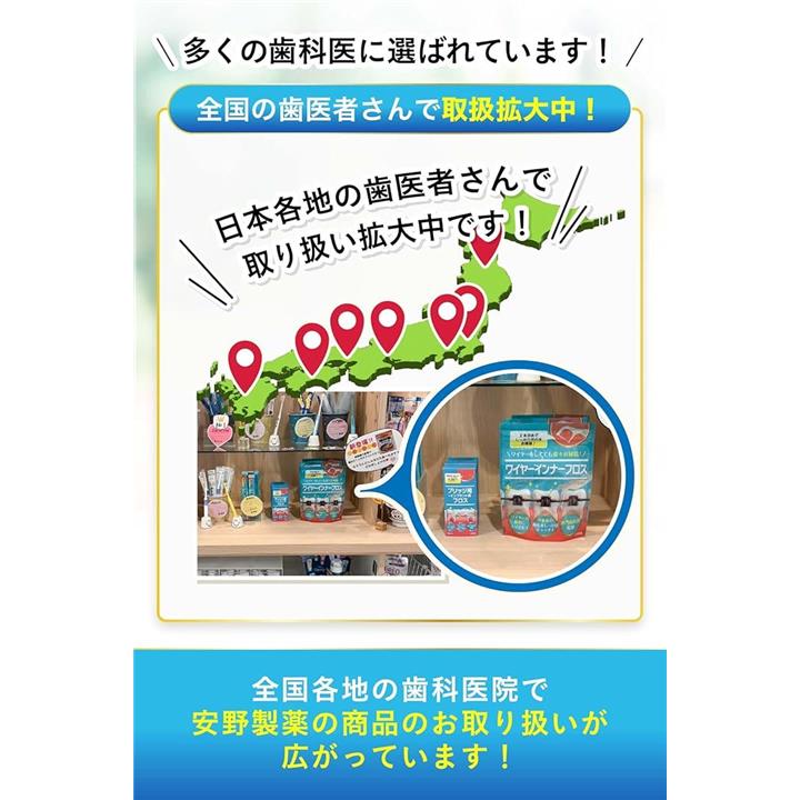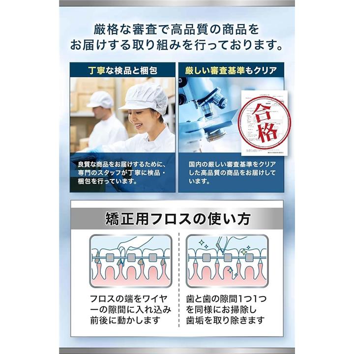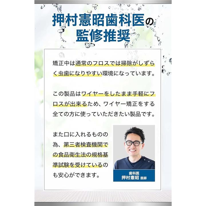 歯医者さんで取扱い中。 矯正用フロス 100本入り 歯とワイヤーの間にスルッと入る。