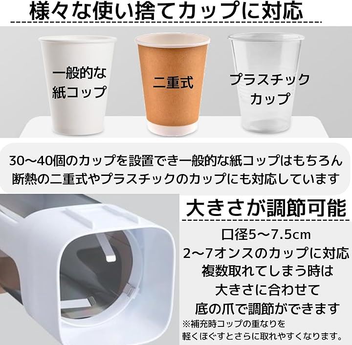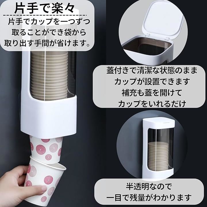 紙コップ カップディスペンサー カップホルダー 壁掛け スタンド ウォーターサーバー 側面 蓋付 粘着テープ式 50~75mmコップ 約40個 収納 白