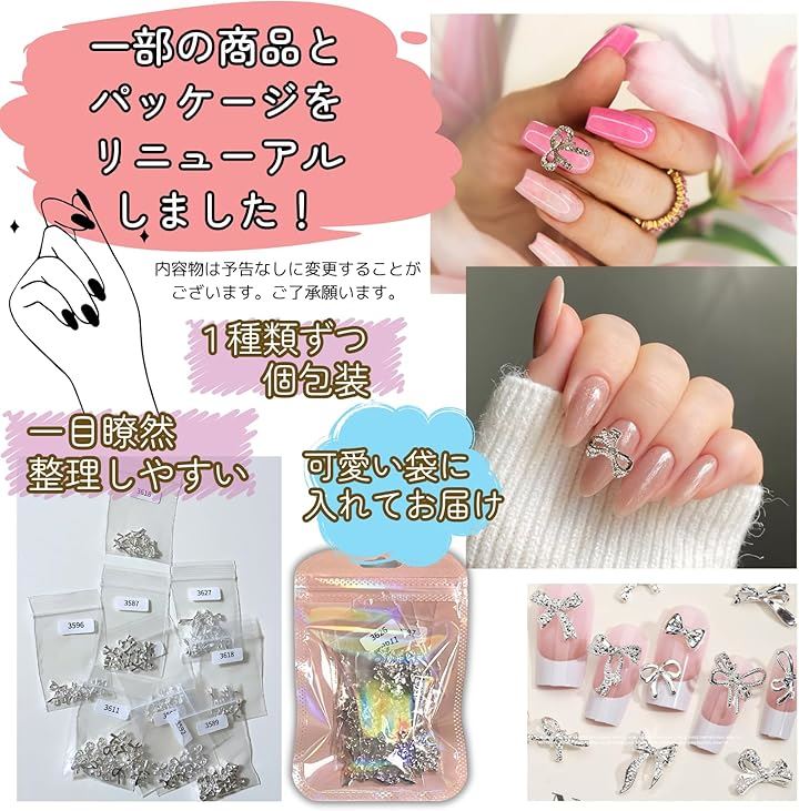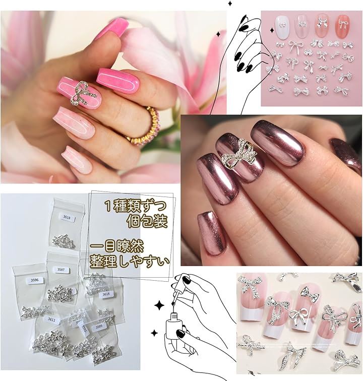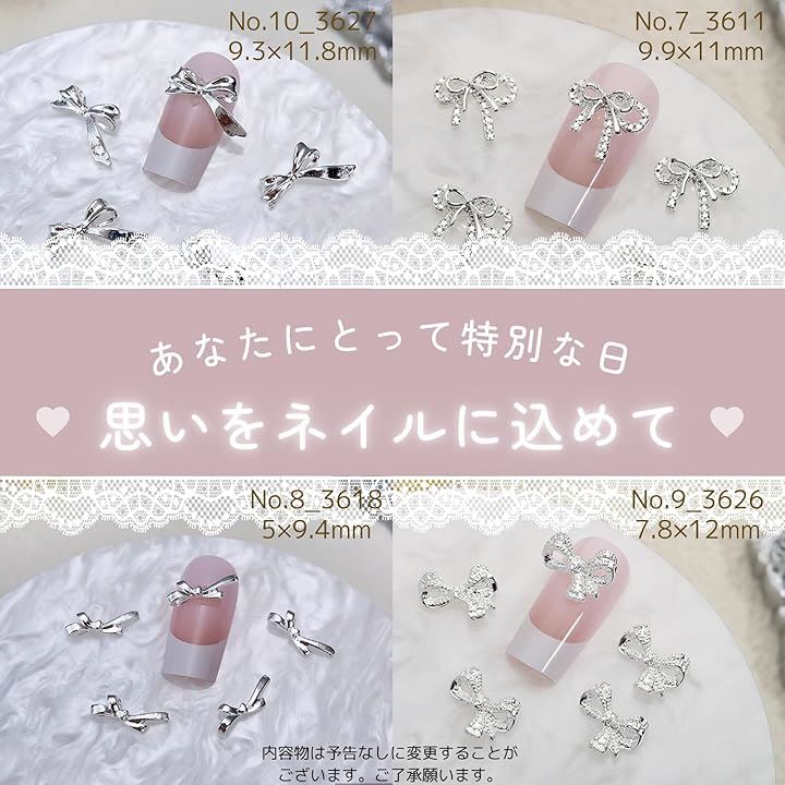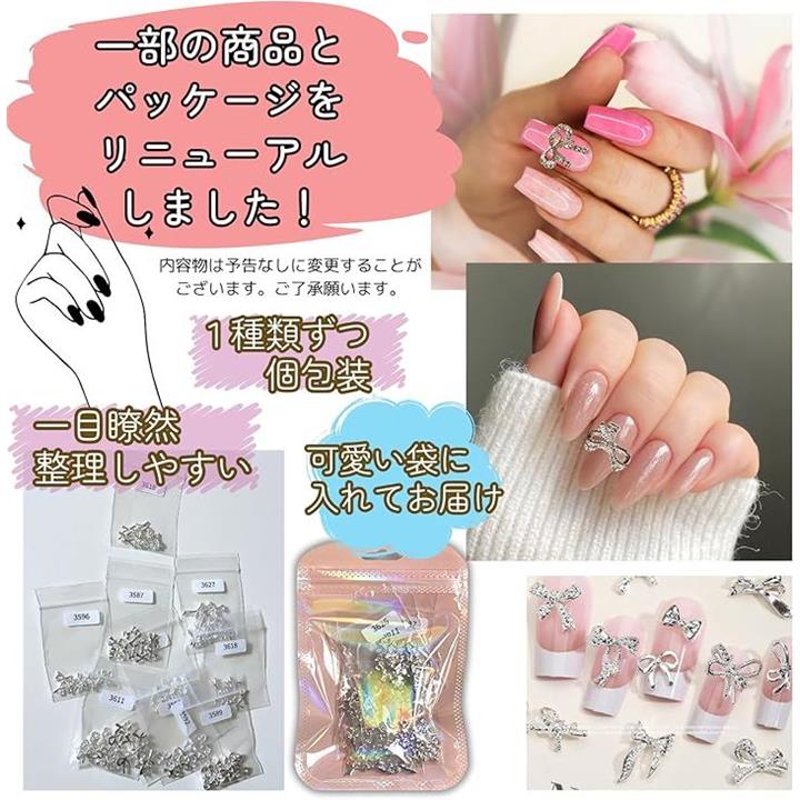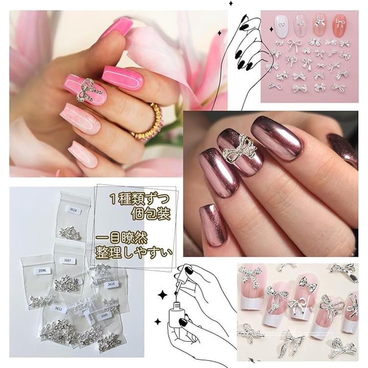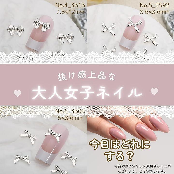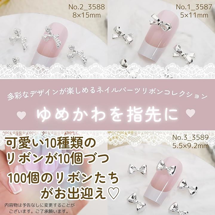 ネイルパーツ リボン シルバー 100個セット 大人フェミニンな3Dミニパーツ10種 ナチュラルカラーx上品デザイン ワンホンネイル ジェルネイル・オフィスネイルに最適
