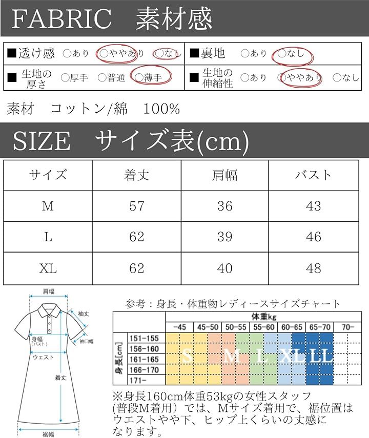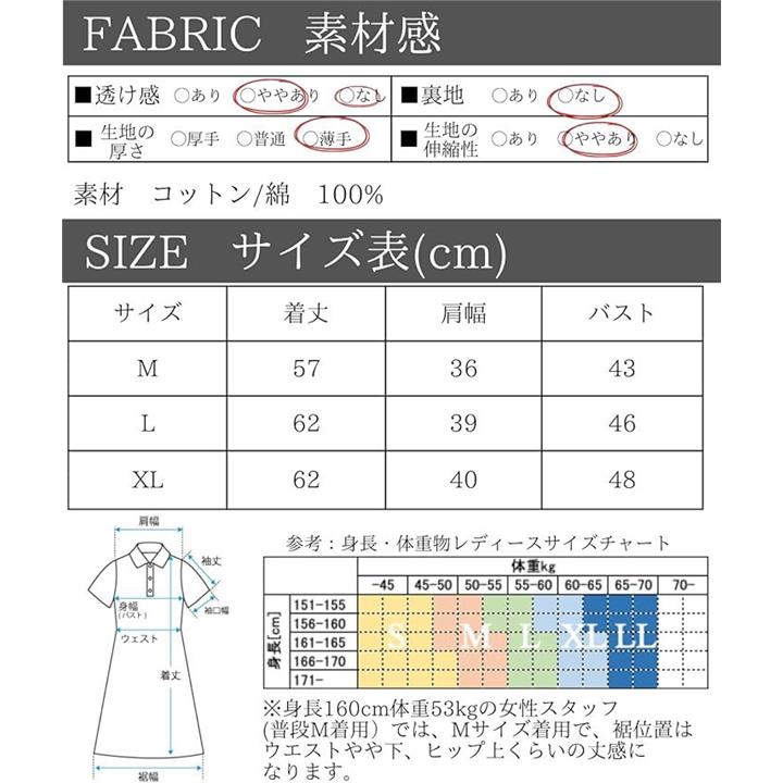 「素材」綿・コットン100% 「カラー」ブラック(黒)、ホワイト(白)、ブルー(青)、グレーブルー(灰青)「サイズ(cm)」M 着丈57/肩幅36/バスト43 L 着丈62/肩幅39/バスト46 XL 着丈62/肩幅40/バスト48