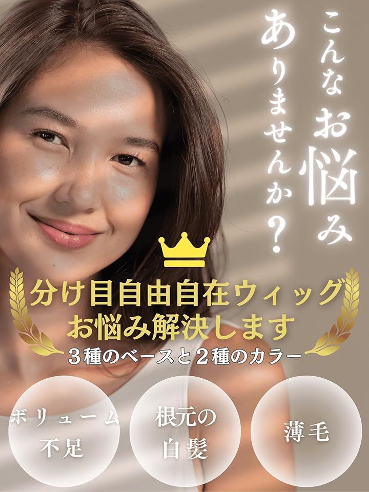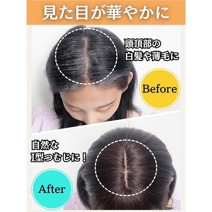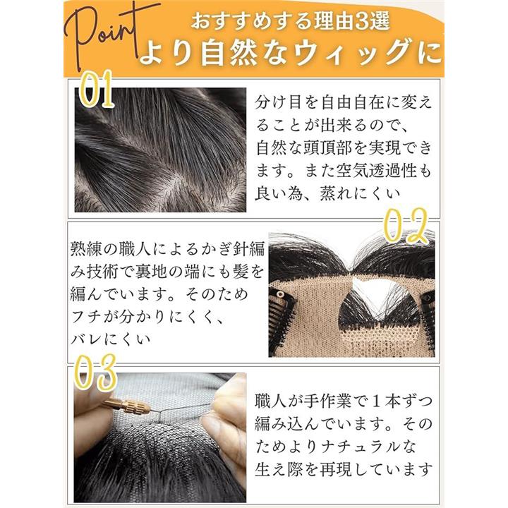 「分け目自由自在」(2)特徴:「ナチュラルウィッグ 35cm」はつむじや頭頂部周りの薄毛や生え際の白髪にお悩みの、ウィッグ、付け毛、カツラ初心者に最適の商品。