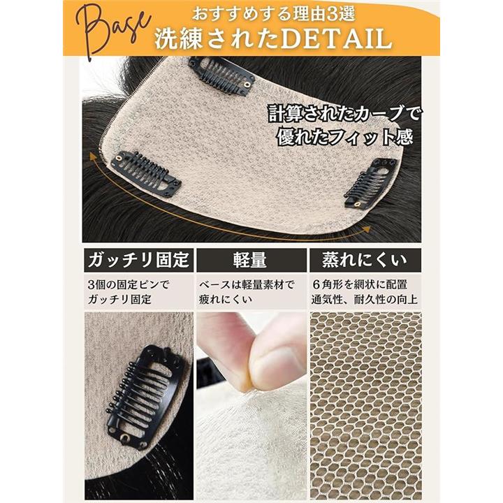 「空気透過性UP」(8)ベース: 強力固定ピンは3つで、より自然なつけ心地を再現致しました。