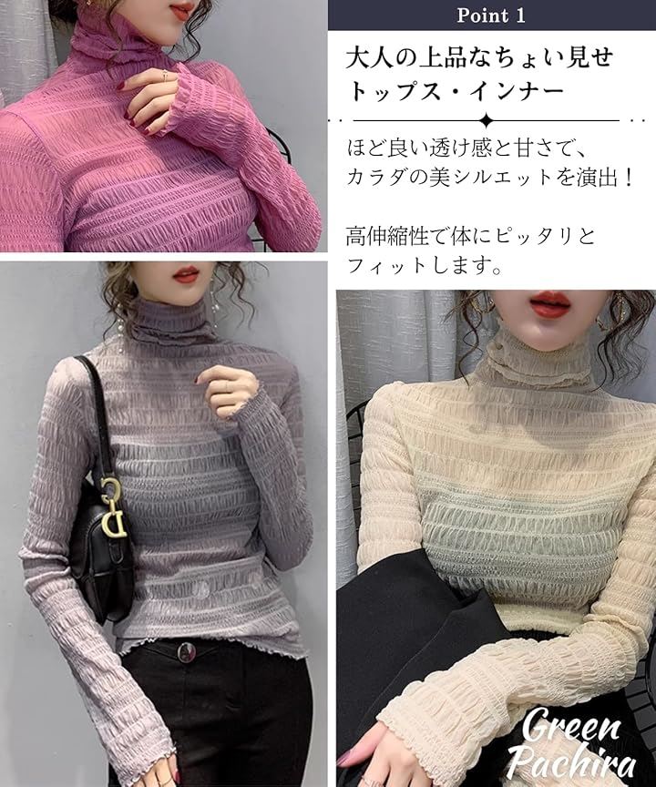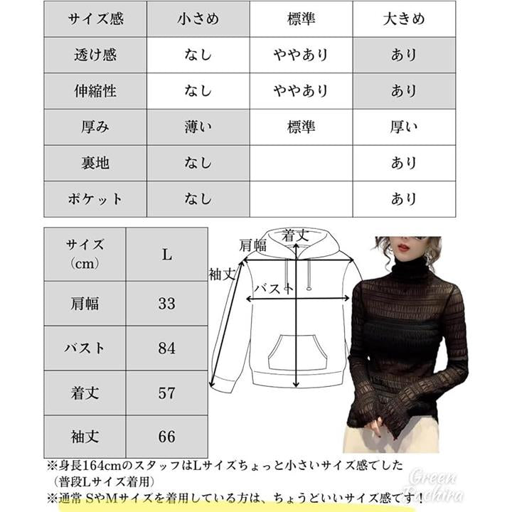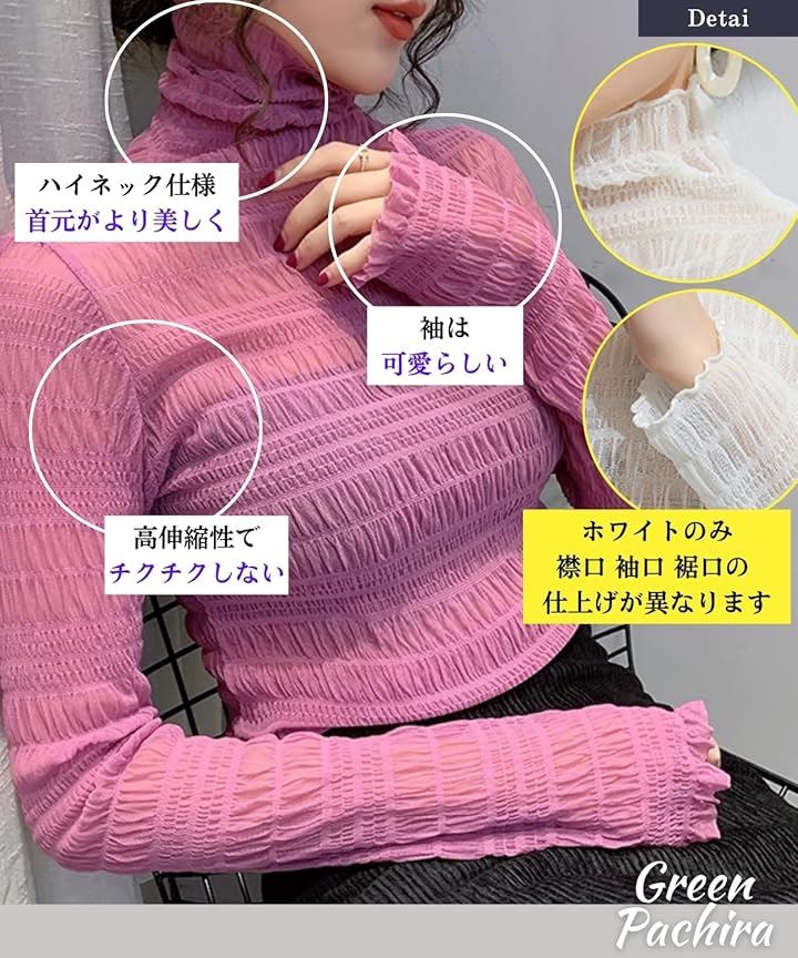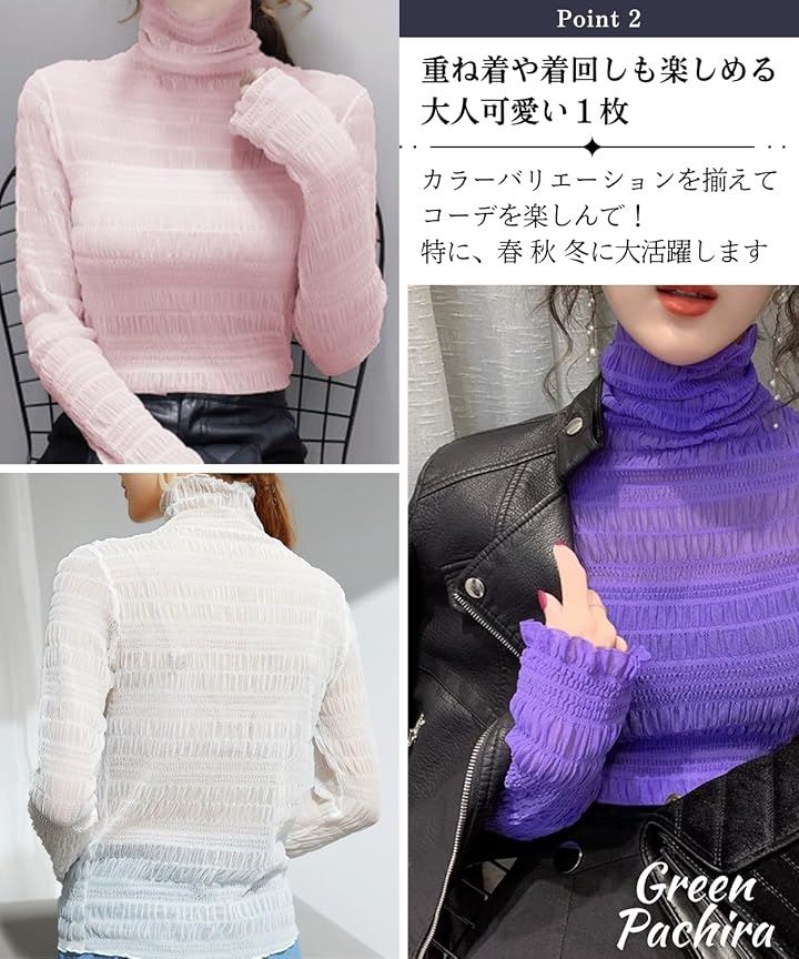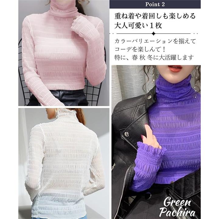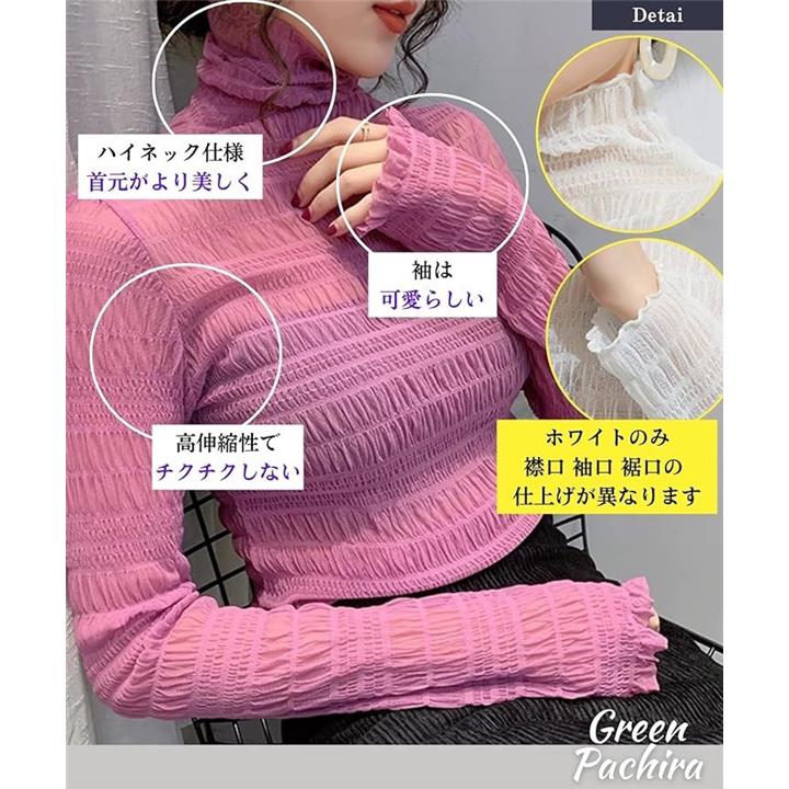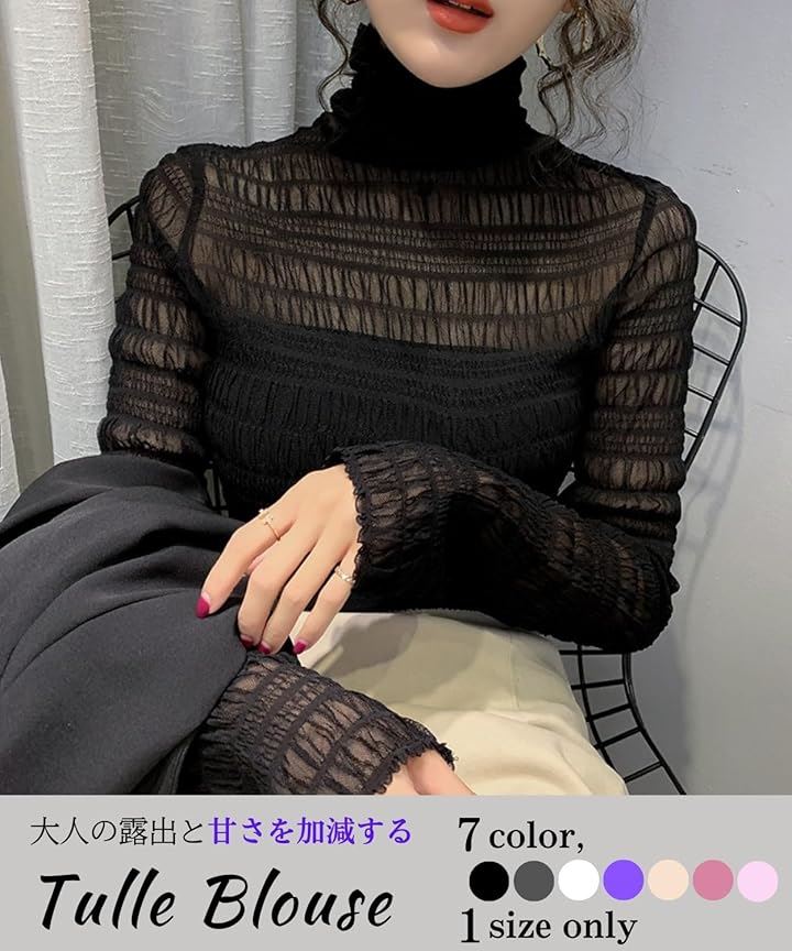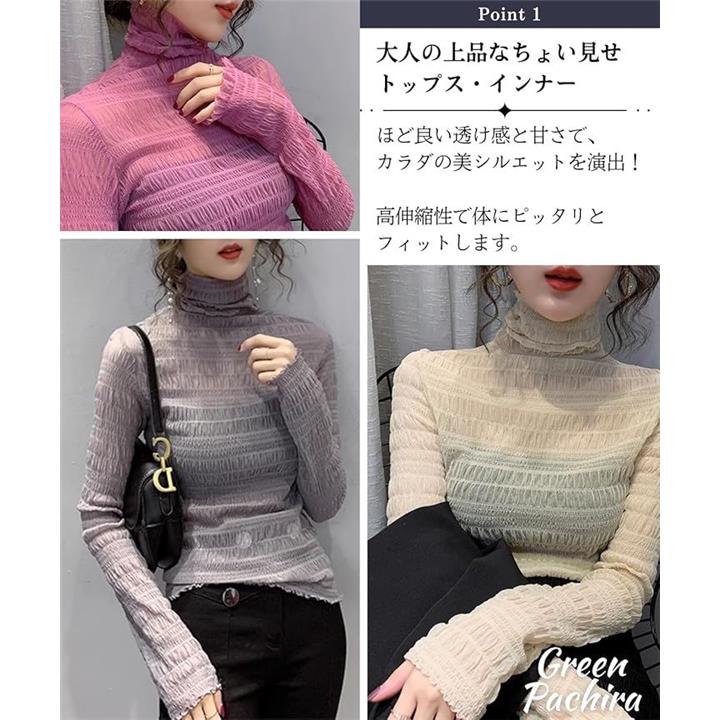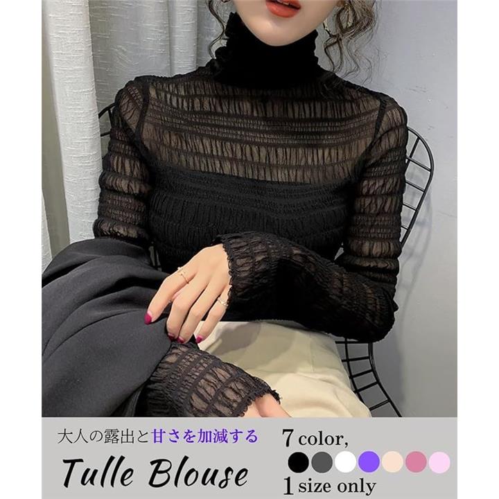 [グリーンパキラ] 可愛い チュール ブラウス インナー トップス シアー シースルー シフォン 透ける 長袖 レディース ハイネック 薄手 軽い 高伸縮 重ね着 着回し |