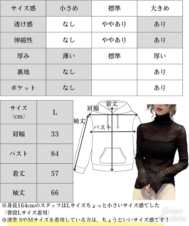 Lサイズ:肩幅 約33cm/バスト 約84cm/着丈 約57cm/袖丈 約66cm。