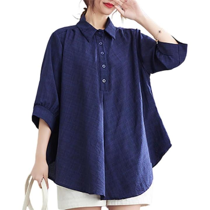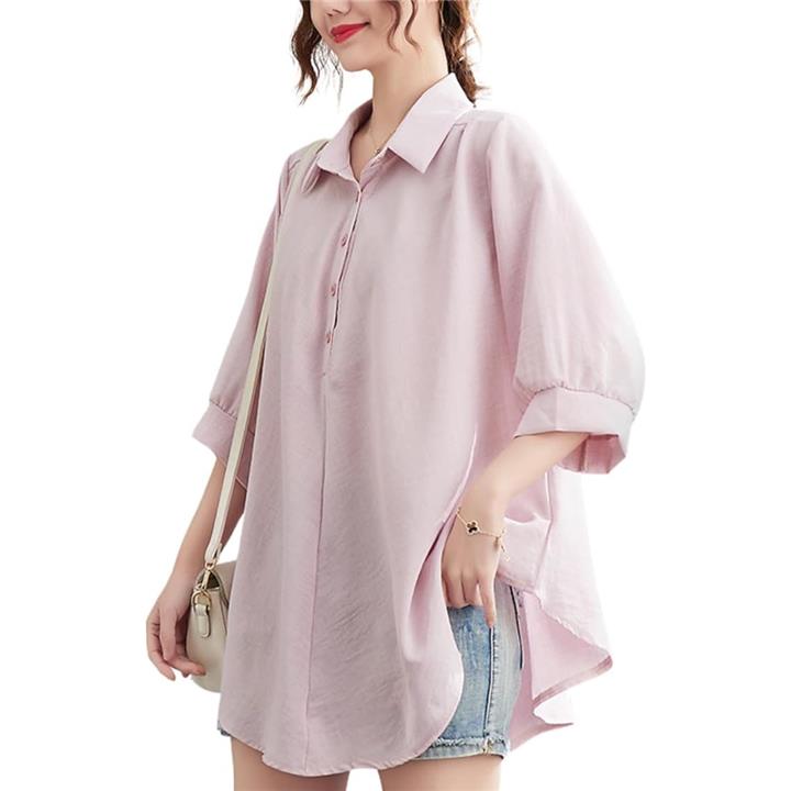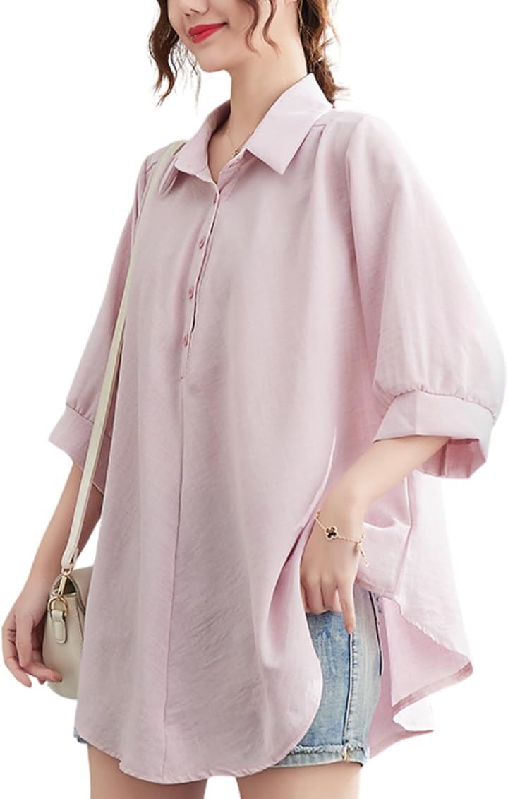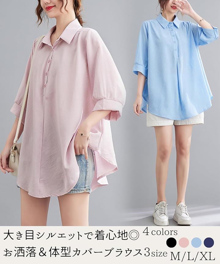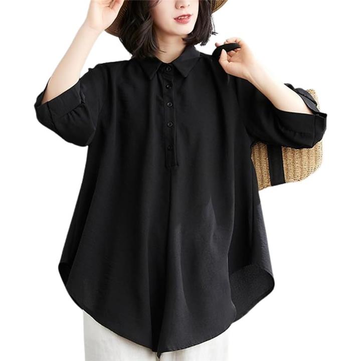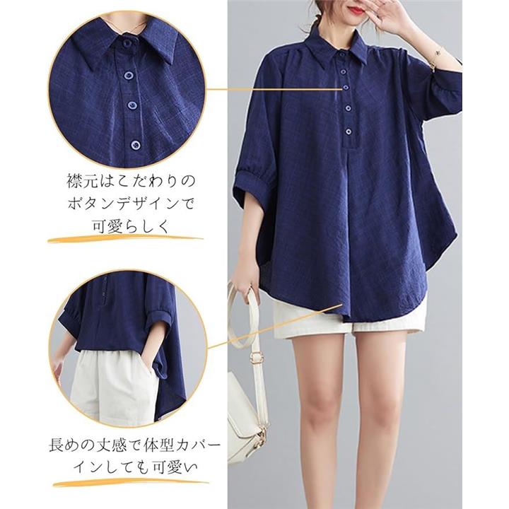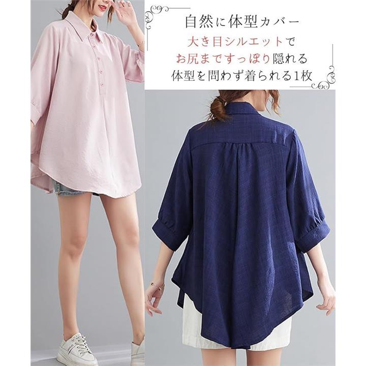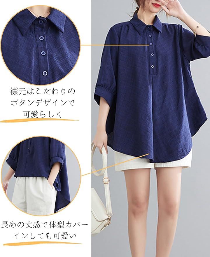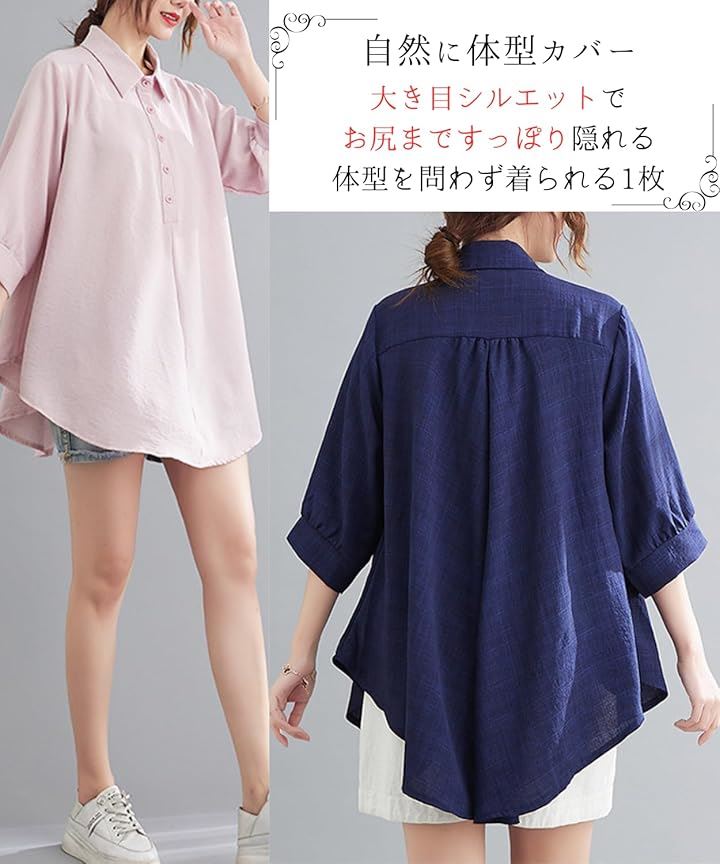大きいサイズにも対応したレディース カットソー シャツで、7分袖・半袖のチュニック風トップスとしても夏にぴったりの1枚です。