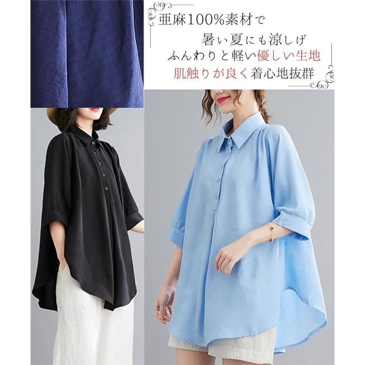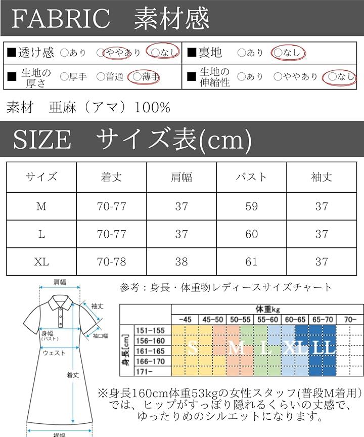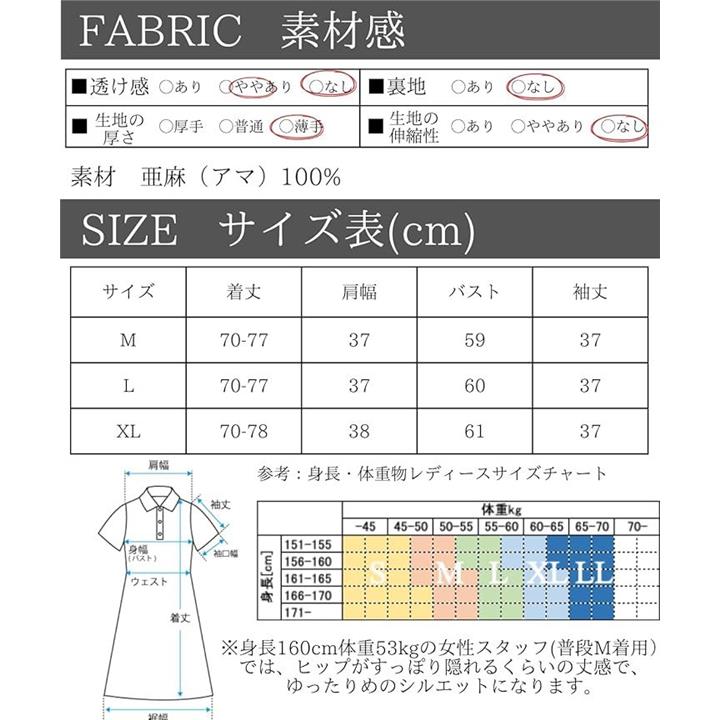 「素材」亜麻100% 「カラー」ブラック、ネイビー、ピンク、ライトブルー「サイズ(cm)」M 着丈70-77/肩幅37/バスト59/袖丈37 L 着丈70-77/肩幅37/バスト60/袖丈37 XL 着丈70-78/肩幅38/バスト61/袖丈37