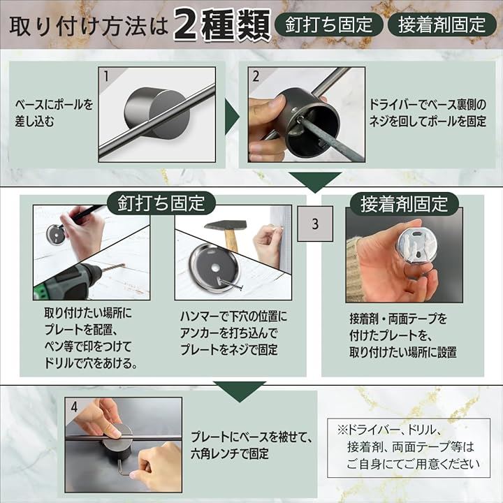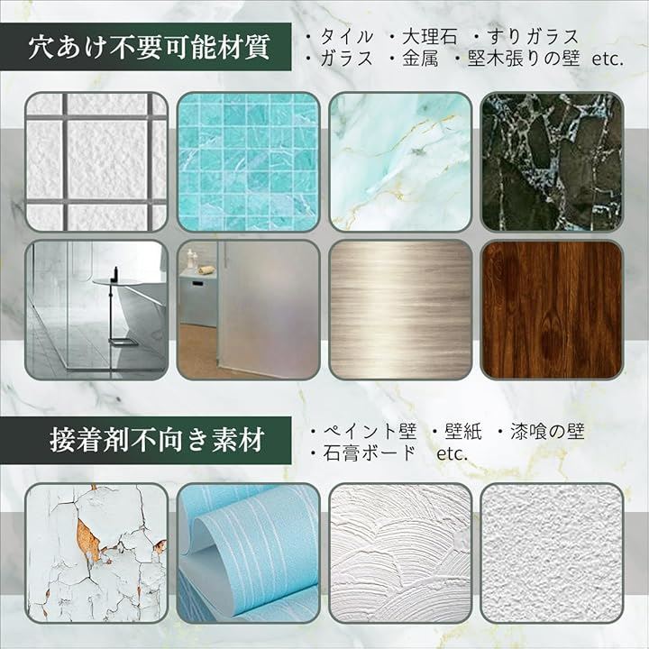 穴あけの必要がないため、タイルや大理石、すりガラス、金属などの穴を開けられない場所への設置も簡単に取り付けが可能です。