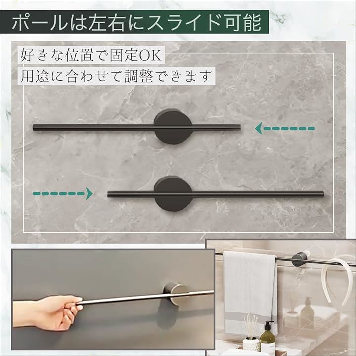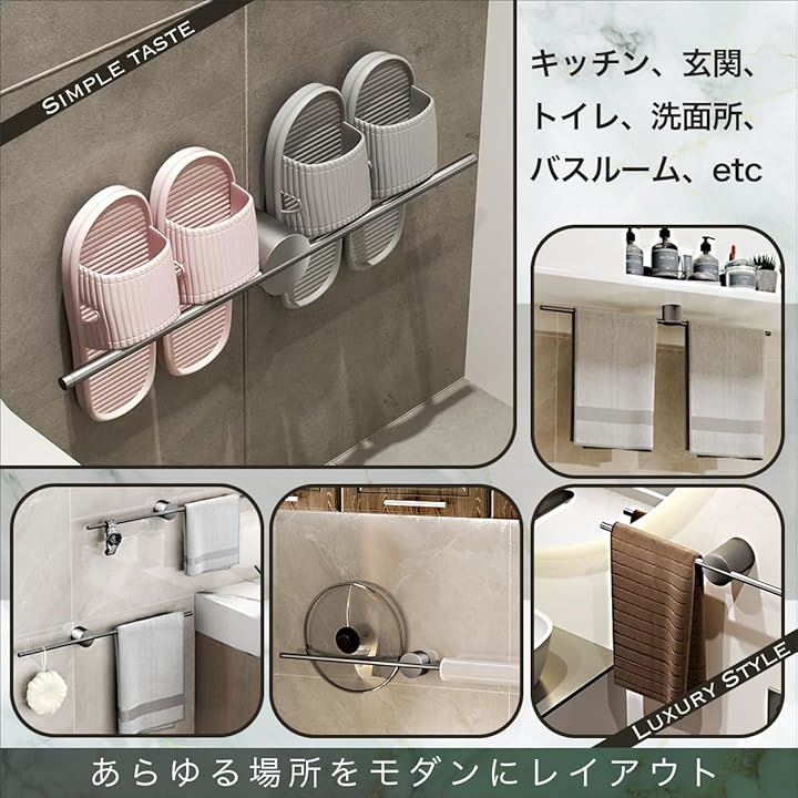 入浴時はタオルやバスローブ、ハンドタオルなどを掛けられ、キッチンや玄関では掃除用具や小物、コートなどの収納にも便利です。