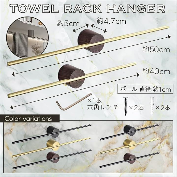 2サイズと4色のバリエーションでどんな空間にもフィット このタオルハンガーは、40cm、50cmの2サイズから選べ、オールブラック、ゴールド、ブラウンxゴールド、ブラウンxブラックの4色のバリエーション。