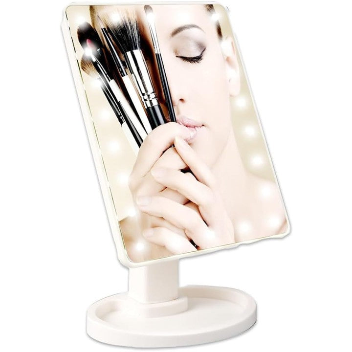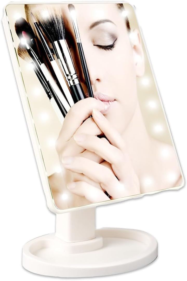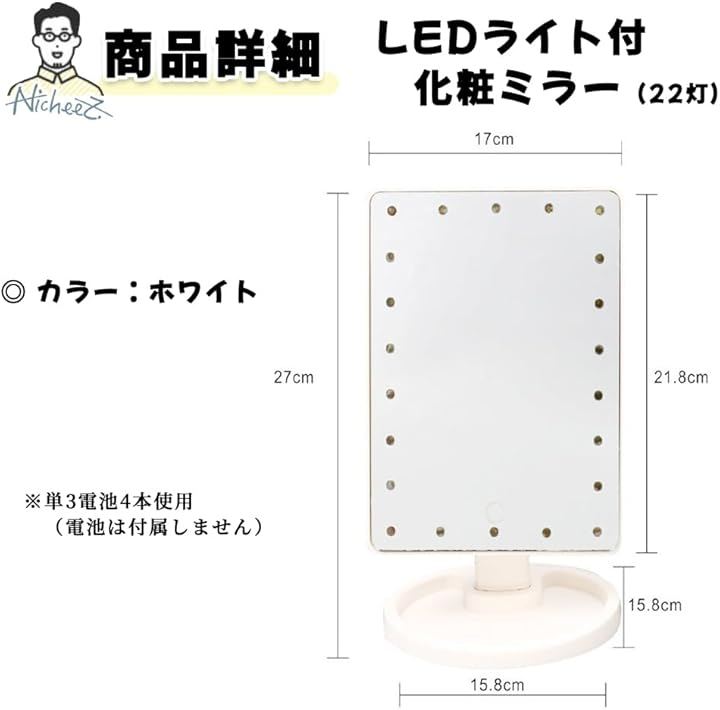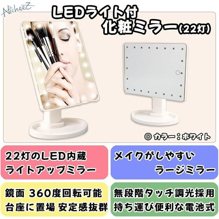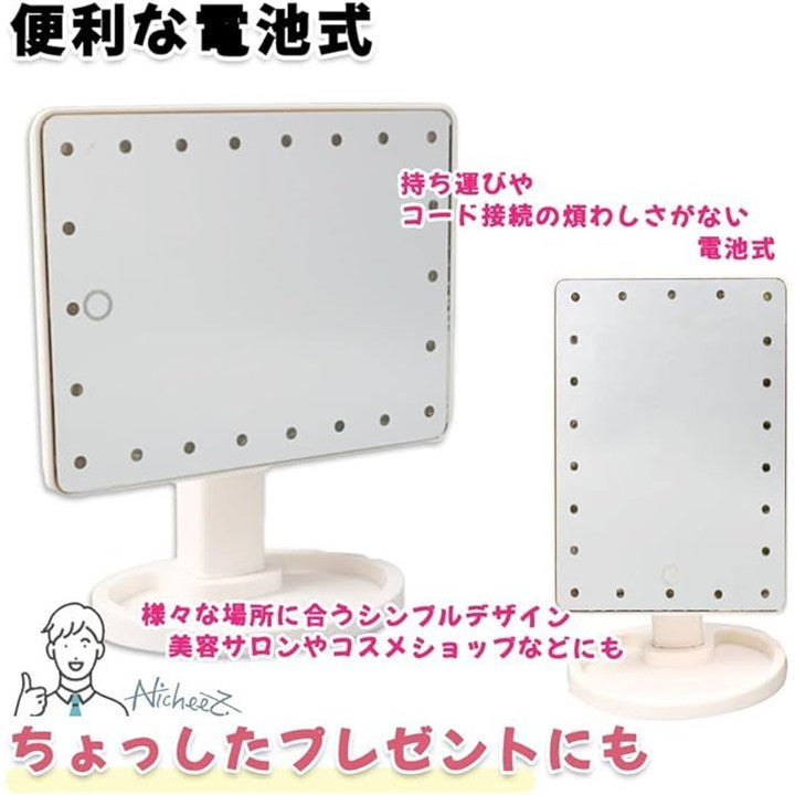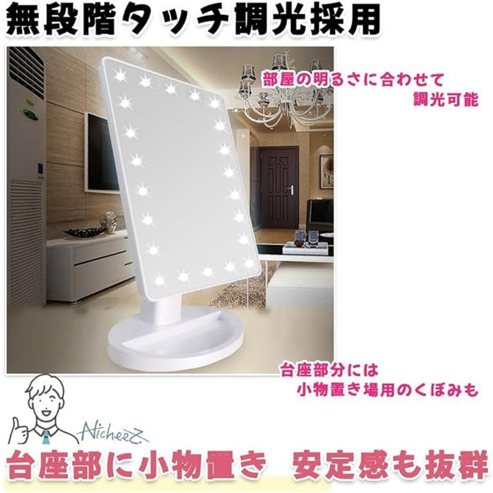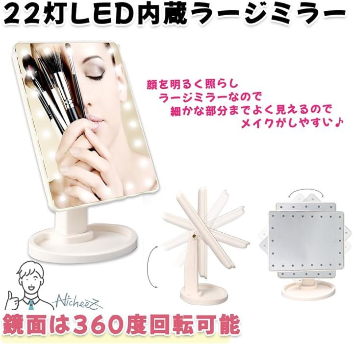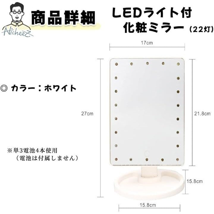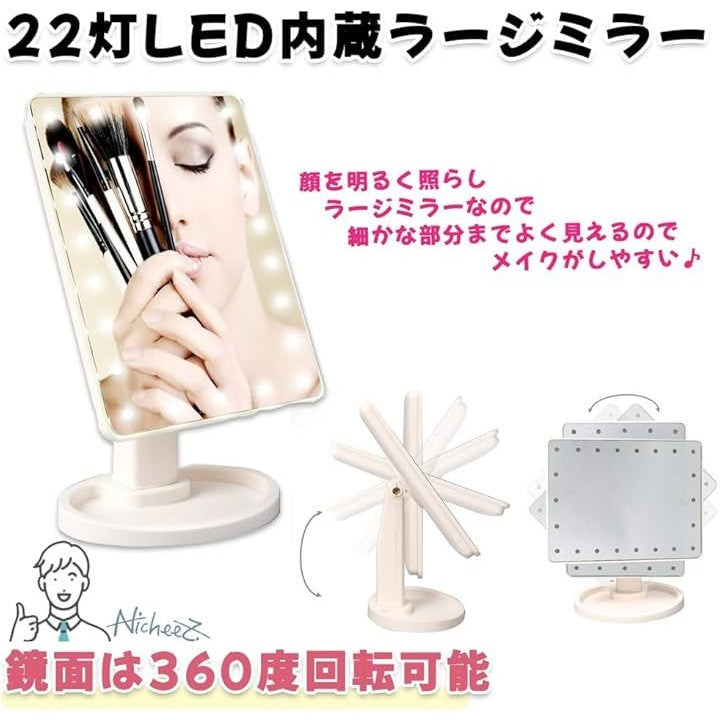 LEDライト付 化粧鏡 女優ミラー 22灯 卓上 360度回転 スタンド付 電池式