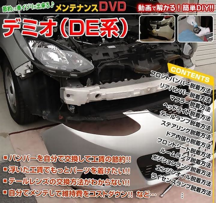 ・電球交換解説(バルブ・ウィンカーランプなど)バンパー交換方法・ヘッドライト交換方法・フロンドドア内張り脱着方法などなど、デミオ(DE3FS) のメンテナンス・各種パーツ交換方法・脱着方法を解説したDVD。