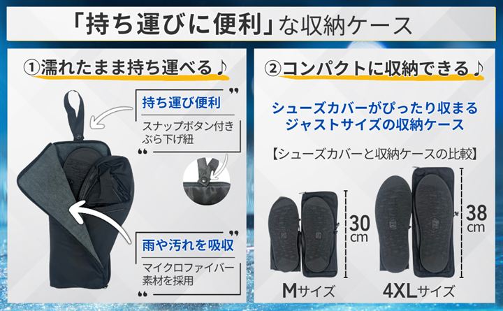 「製品仕様」セット内容:シューズカバー左右セットx1、専用吸水ケースx1。