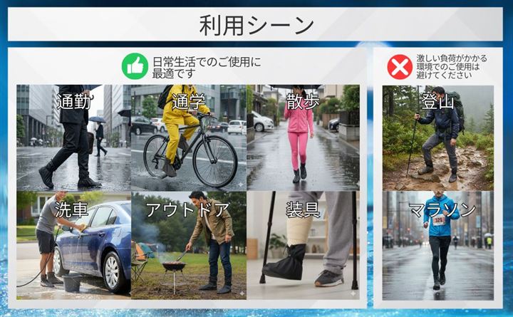 「使用上の注意事項」・本製品は完全防水仕様ですが、長時間の使用や過度な摩擦により耐久性が低下する場合があります。
