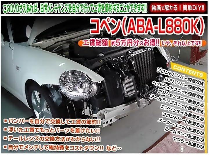 ダイハツ コペン L880K メンテナンスオールインワンDVD ・ジャッキアップ方法の解説やエンジンオイル交換方法・ライト交換方法・ フロント(リア)バンパー交換方法・内張り交換方法などなど、コペン L880K の 各種パーツの取外し方法や取付け方法、改造やチューニングを解説したDVDです。