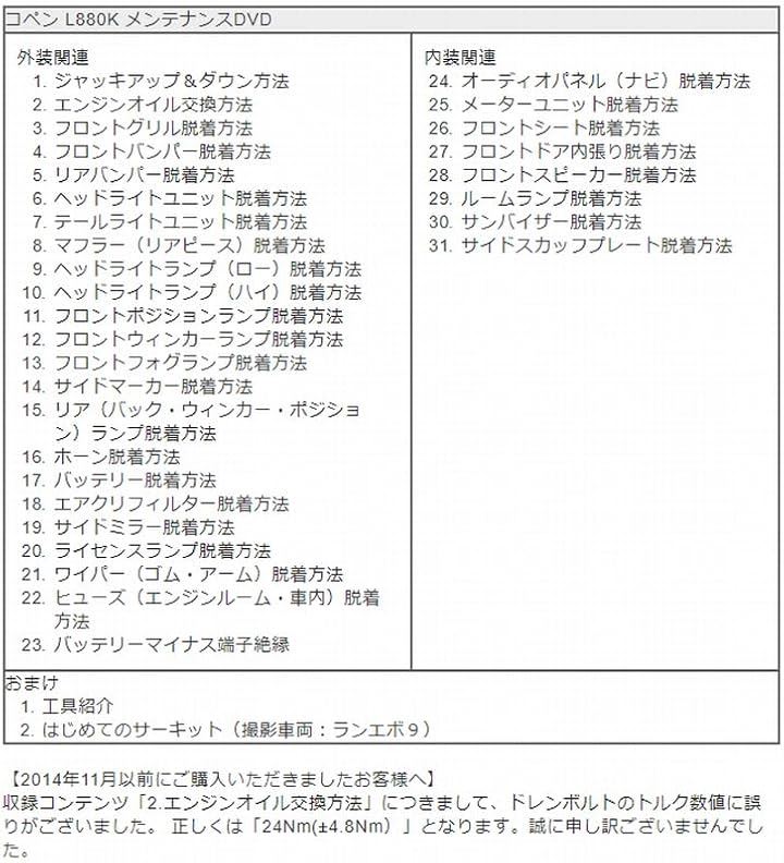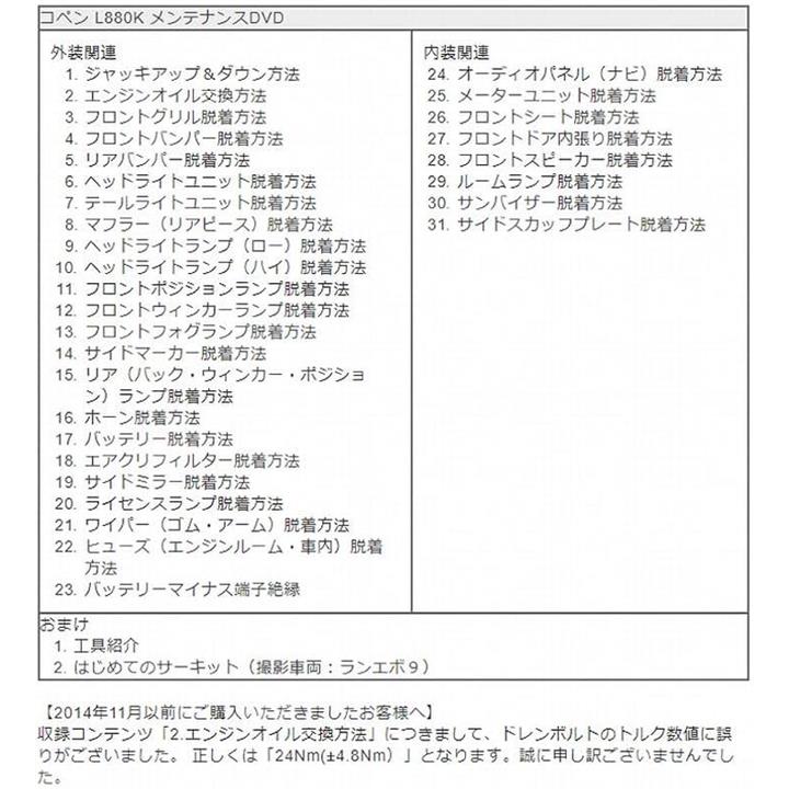 コペン L880K DVD収録内容:[外装編] 1. ジャッキアップ&ダウン方法 2. エンジンオイル交換方法 3. フロントグリル脱着方法 4. フロントバンパー脱着方法 5. リアバンパー脱着方法 6. ヘッドライトユニット脱着方法 7. テールライトユニット脱着方法 8. マフラー(リアピース)脱着方法 9. ヘッドライトランプ(ロー)脱着方法 10. ヘッドライトランプ(ハイ)脱着方法 11. フロントポジションランプ脱着方法 12. フロントウィンカーランプ脱着方法 13. フロントフォグランプ脱着方法 14. サイドマーカー脱着方法 15. リア(バック・ウィンカー・ポジション)ランプ脱着方法 16. ホーン脱着方法 17. バッテリー脱着方法 18. エアクリフィルター脱着方法 19. サイドミラー脱着方法 20. ライセンスランプ脱着方法 21. ワイパー(ゴム・アーム)脱着方法 22. ヒューズ(エンジンルーム・車内)脱着方法 23. バッテリーマイナス端子絶縁方法
