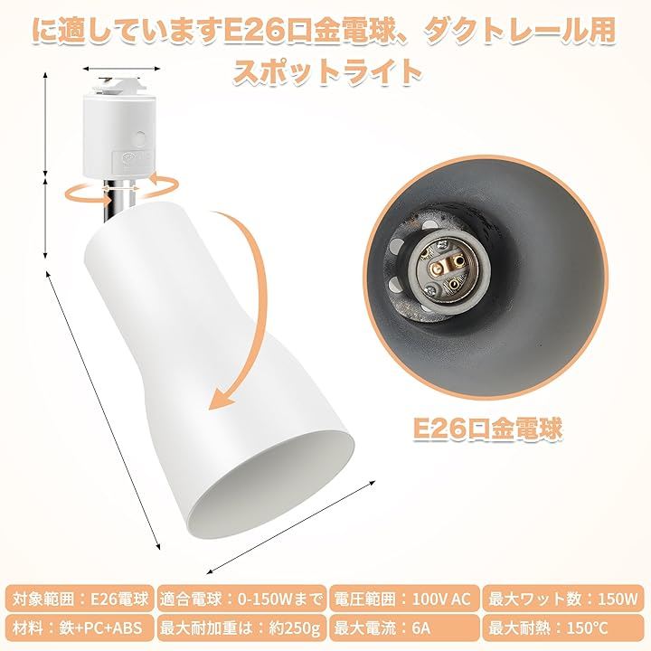 1、ダクトレール専用の照明となります(4個セット): 重量:約1120g 口金:E26、カラー:ホワイト(白い)、定格電圧:AC100V、使用可能電球:150Wまで *電球は付属しておりません。