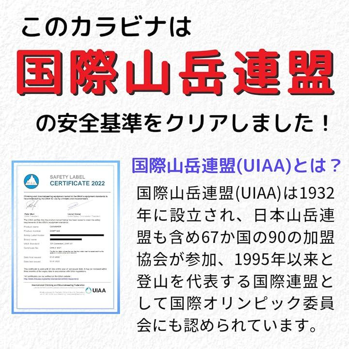 ・「安全性」国際山岳連盟(UIAA)の厳しい安全基準をクリアしたカラビナでCE,ENマークも取得しています。