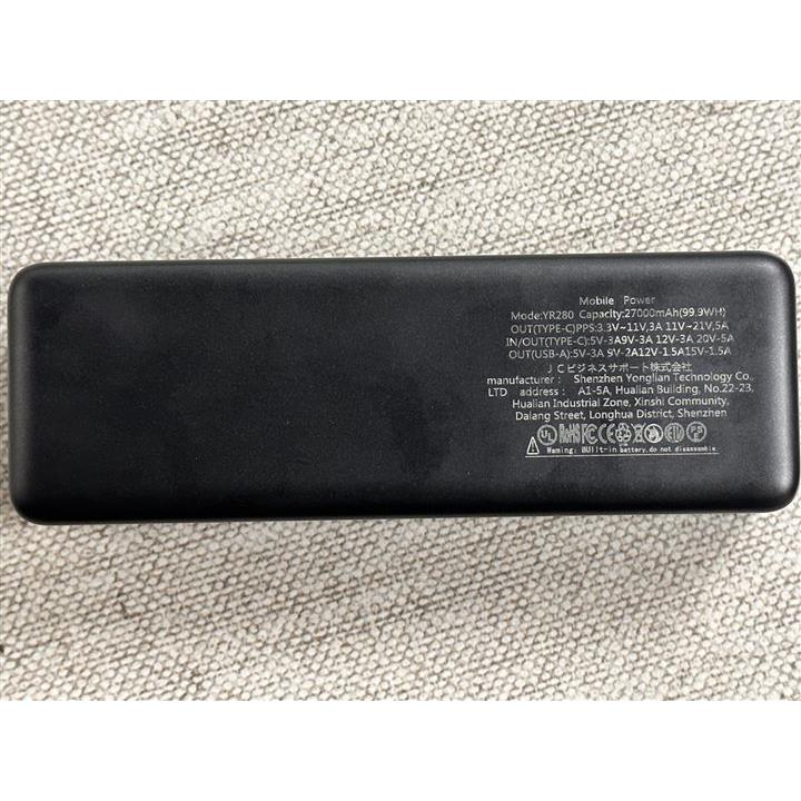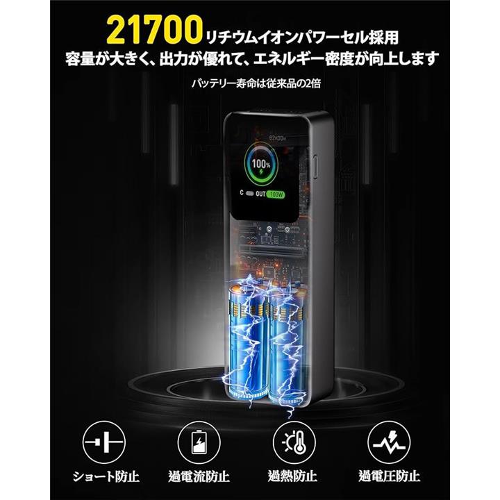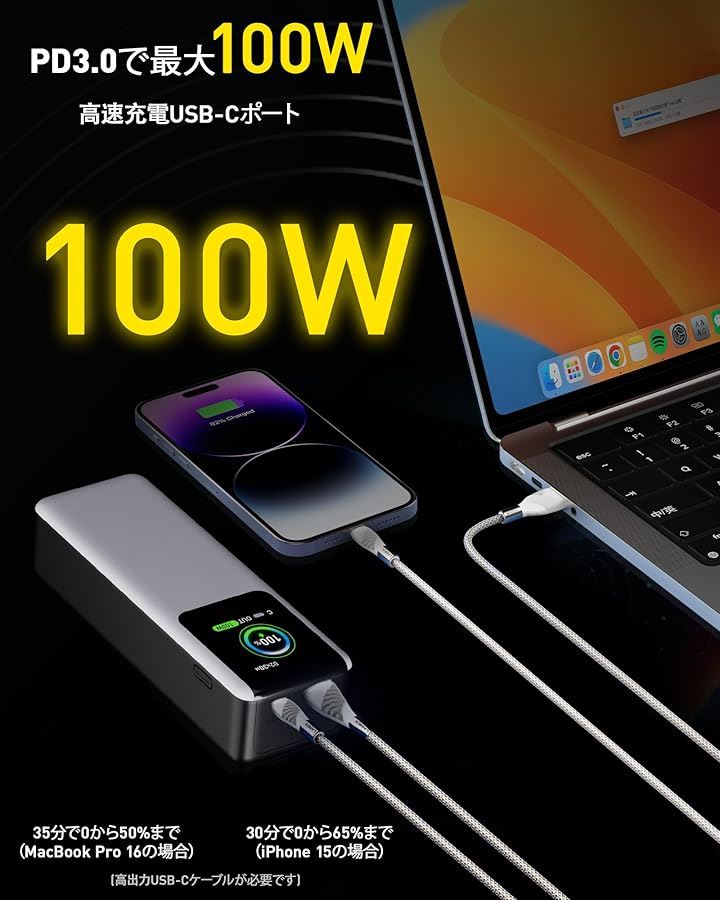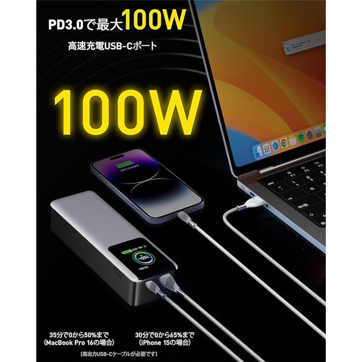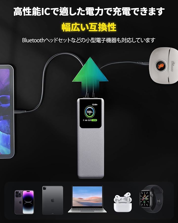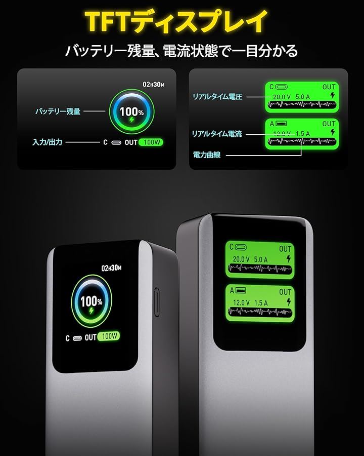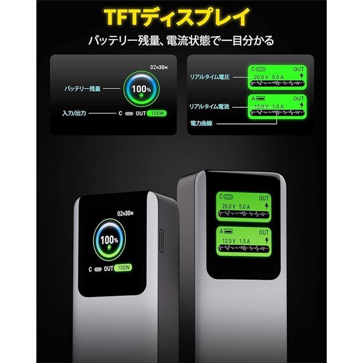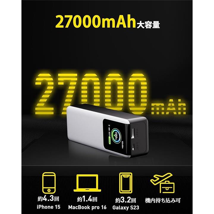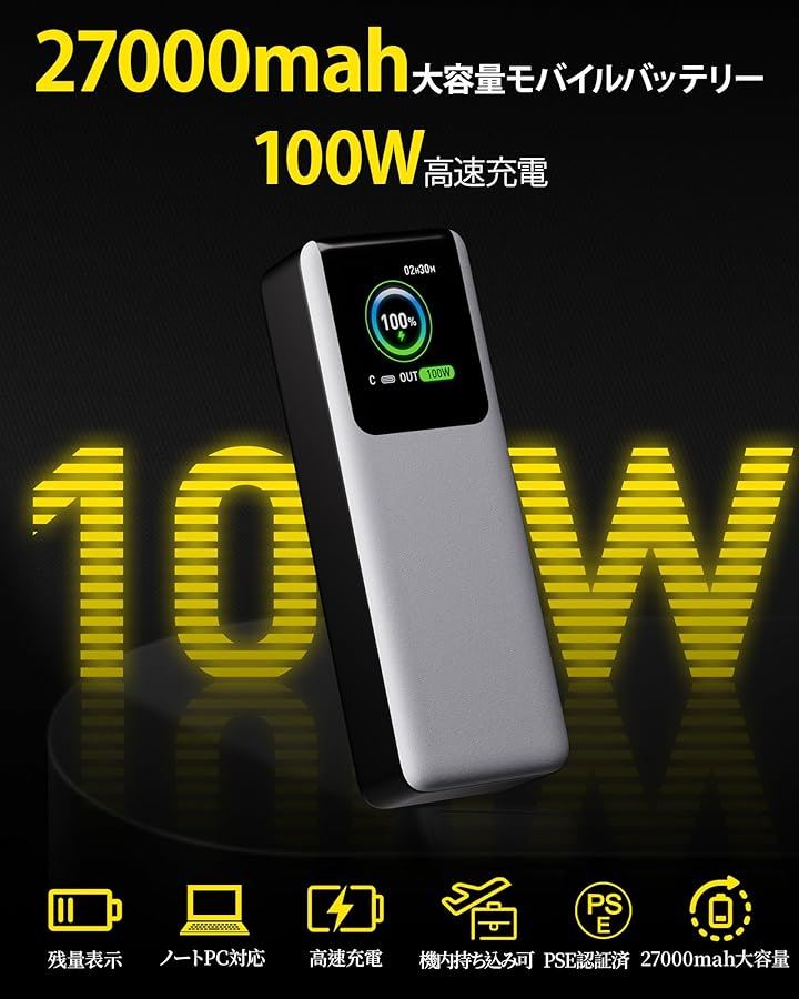 互換品 モバイルバッテリー 大容量 27000mah 100W高出力 急速充電 TFTディスプレイ LCD残量表示 PD3.0 縦置きデザイン 2ポート 機内持ち込み可能 2台同時充電 パススルー機能 低電流モード搭載 ケーブル付き 日本語取扱説明書付き