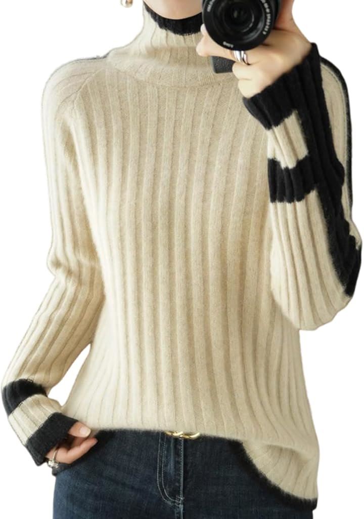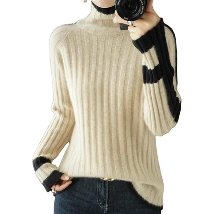 [ニーマンバイ] 配色 ニット ライン リブニット タートル セーター あったか プルオーバー 秋冬 レディース ゆったりニット 4A-N20-WHL |