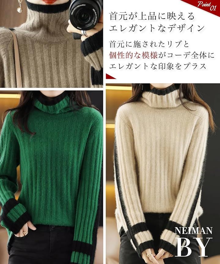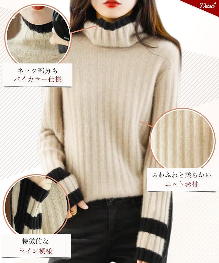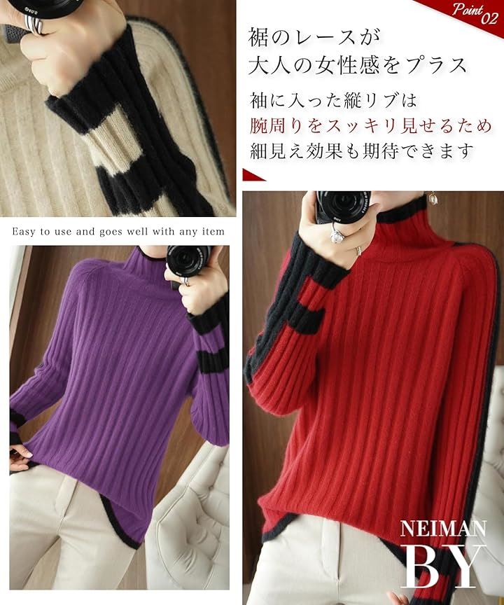[ニーマンバイ] 配色 ニット ライン リブニット タートル セーター あったか プルオーバー 秋冬 レディース ゆったりニット 4A-N20-RDM |