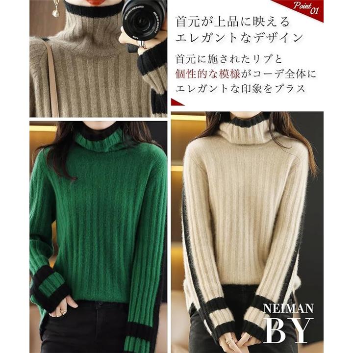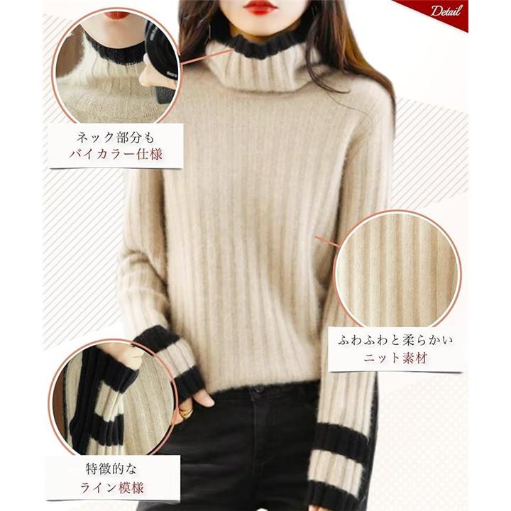 [ニーマンバイ] 配色 ニット ライン リブニット タートル セーター あったか プルオーバー 秋冬 レディース ゆったりニット 4A-N20-BEM |