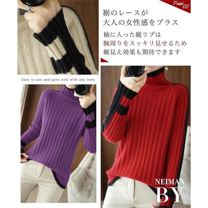 [ニーマンバイ] 配色 ニット ライン リブニット タートル セーター あったか プルオーバー 秋冬 レディース ゆったりニット 4A-N20-RDL |