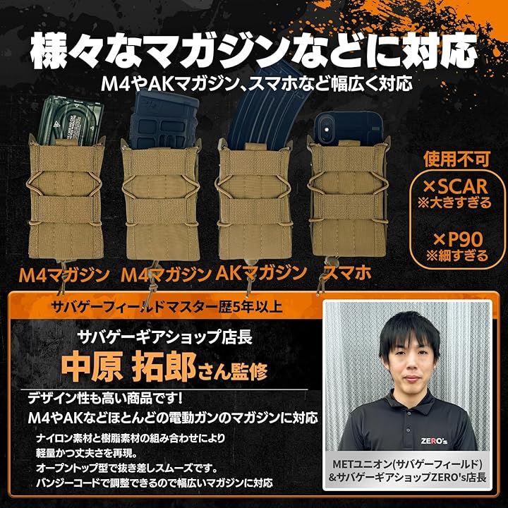 「多用途」マガジンの他に、トランシーバーやライトなどタクティカルツールやスマホなども収納可能です。