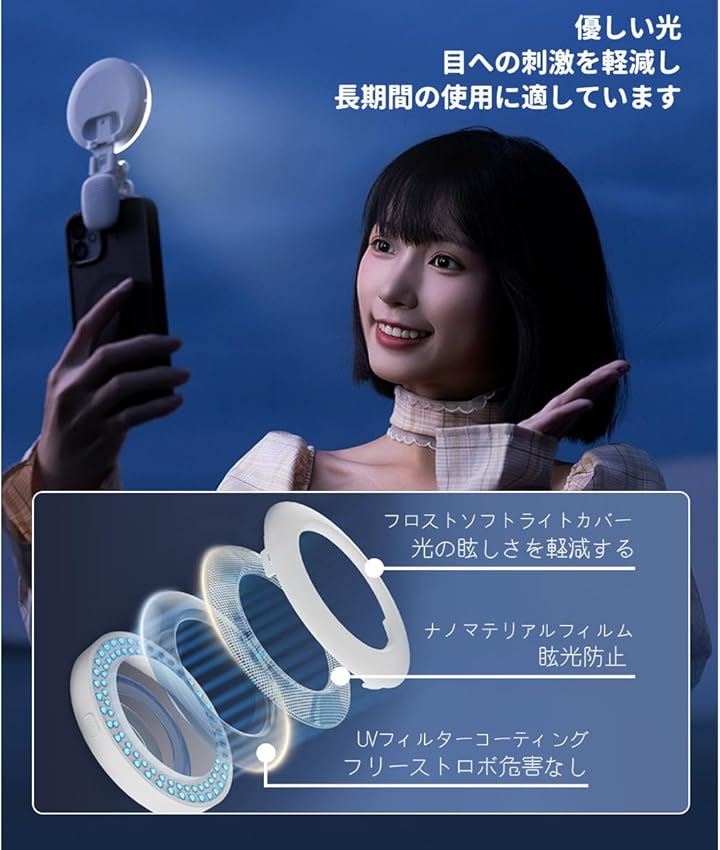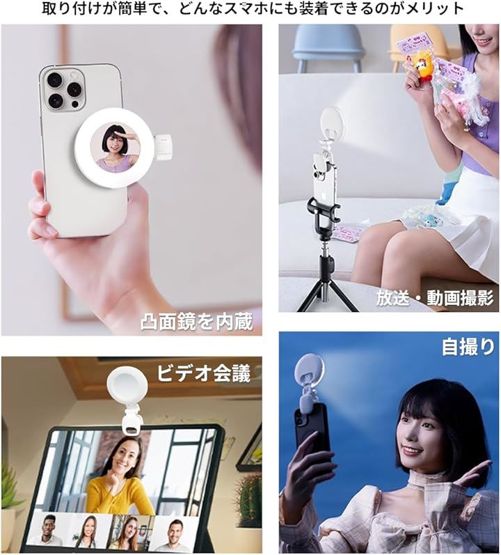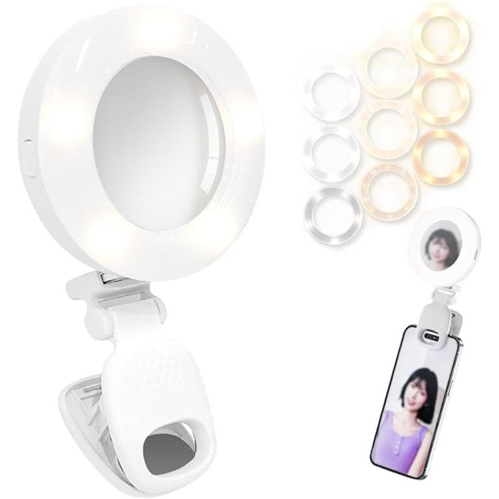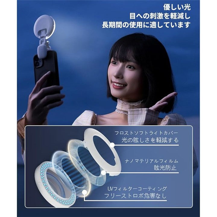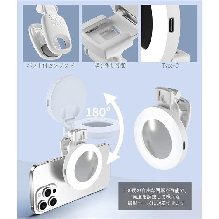 LEDリングライト 自撮りライト ミニ スマホライト クリップ 配信ライト 女優ライト CRI90 3色モード 9段階調光 折りたたみ USB給電式 180度回転可能 美顔照明