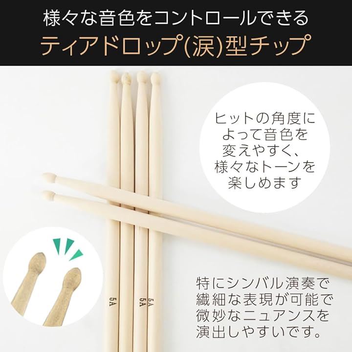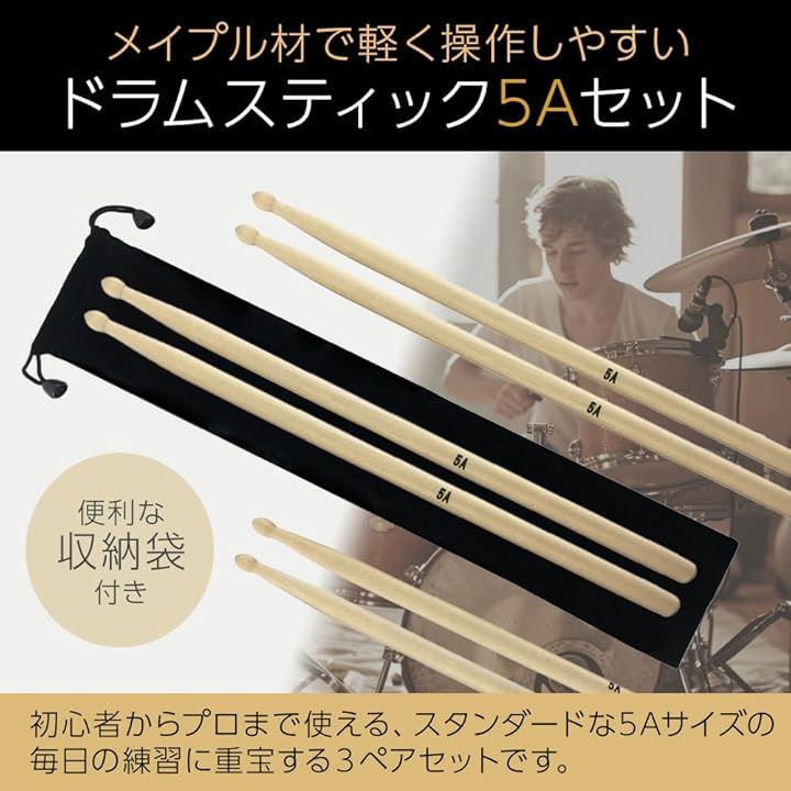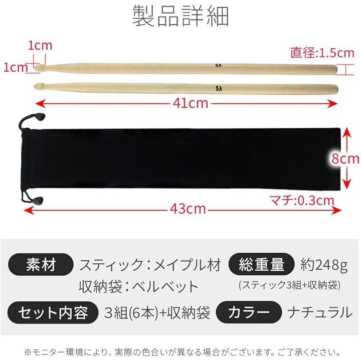 ドラムスティック5A ドラム練習用 メイプル製 3ペアセット