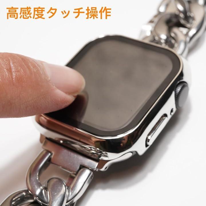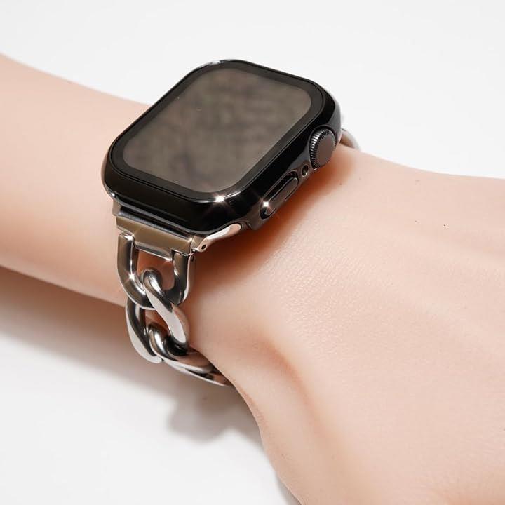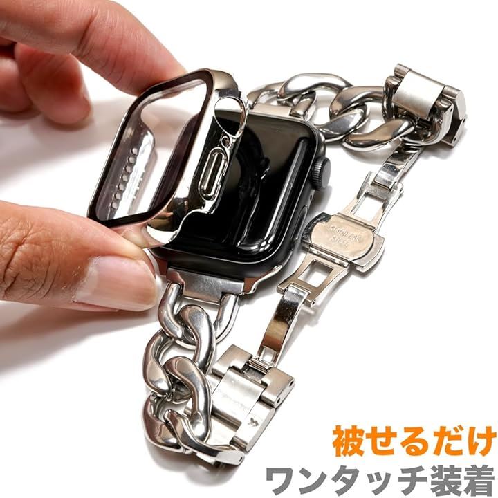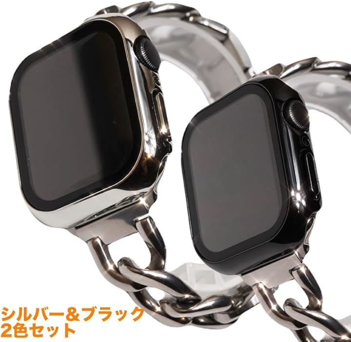 Royce&Roland Apple Watch 用 ステンレスチェーン 対応 カバー ケース シルバー/ブラック 2個セット 保護 防水 ガラスフィルム PC素材 メタル調 光沢 頑丈 軽量 耐衝撃 (40mm) |