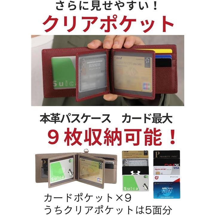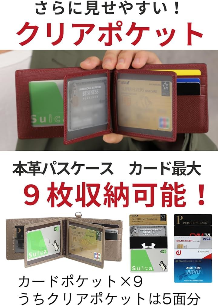 「大容量。最大9枚のカード収納/5つのカードポケット」最大9枚のカードケースと5つのカードポケットを上手く使い分けることで、ICカードが重なることを起こりうる改札でのエラーも防止できますので、電車やバスの乗り継ぎもスムーズに行える定期入れです。