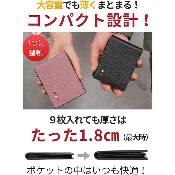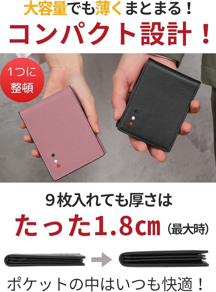 最大9枚のカードを収納可能で、日常使いから通勤・通学まで幅広い用途のカードに対応しています。