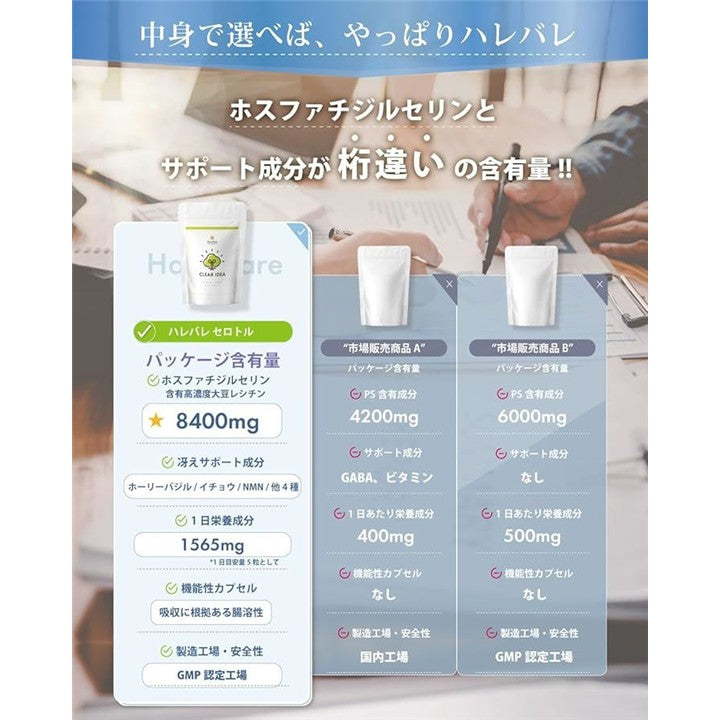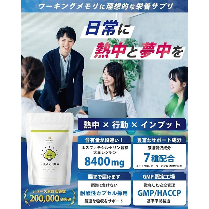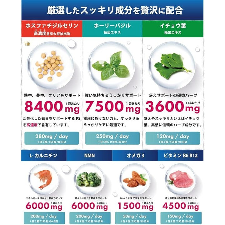 熱中を応援ホスファチジルセリン サプリメント PS 8400mg/袋 ホーリーバジル 7500mg NMN 6000mg イチョウ葉 L-カルニチン 150粒 耐酸性カプセル クリアアイディアPS ハレバレ