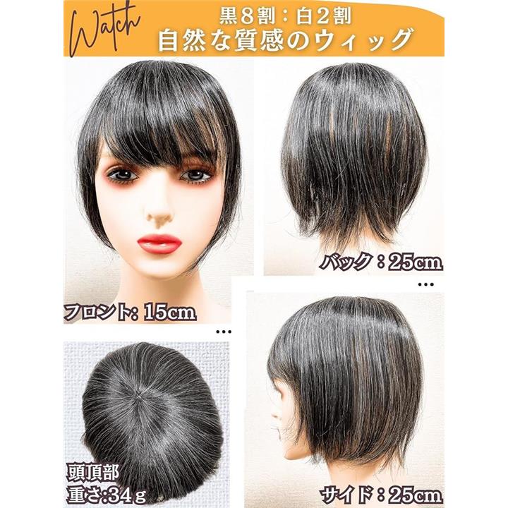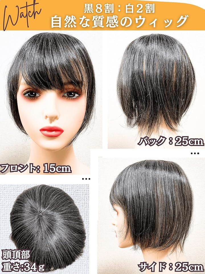 「商品詳細」(2)サイズ:フロント 15cm / サイド 25cm / バック 25cm ベースサイズ:縦12cm / 横8cm (3)重さ:約34g (4)カラー:白8:黒2, 白5:黒5, 白2:黒8 (全部で3種類カラーございます) (5)対象: レディース 女性 医療用 プレゼント 中高年 (7)用途: うぃっぐ ウィッグ かつら 部分ウィッグ