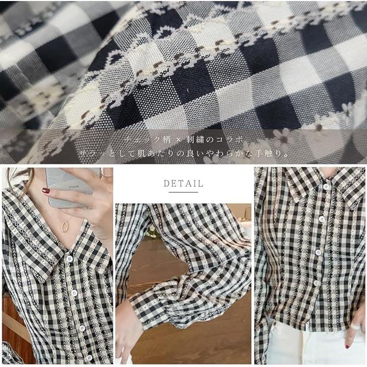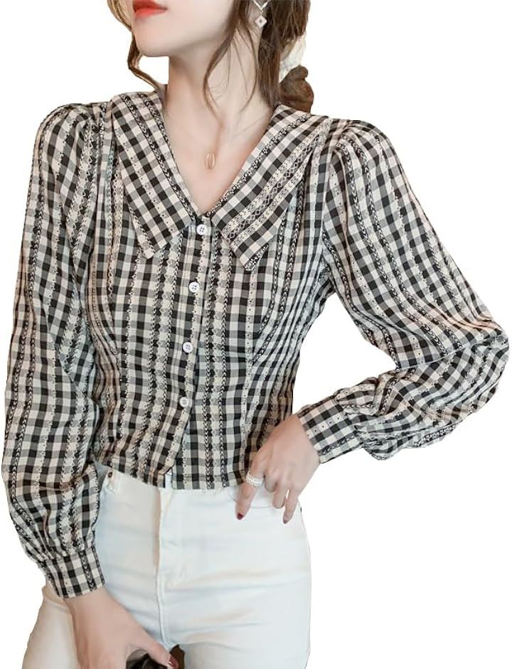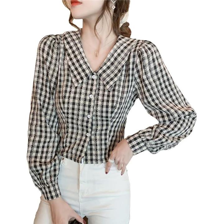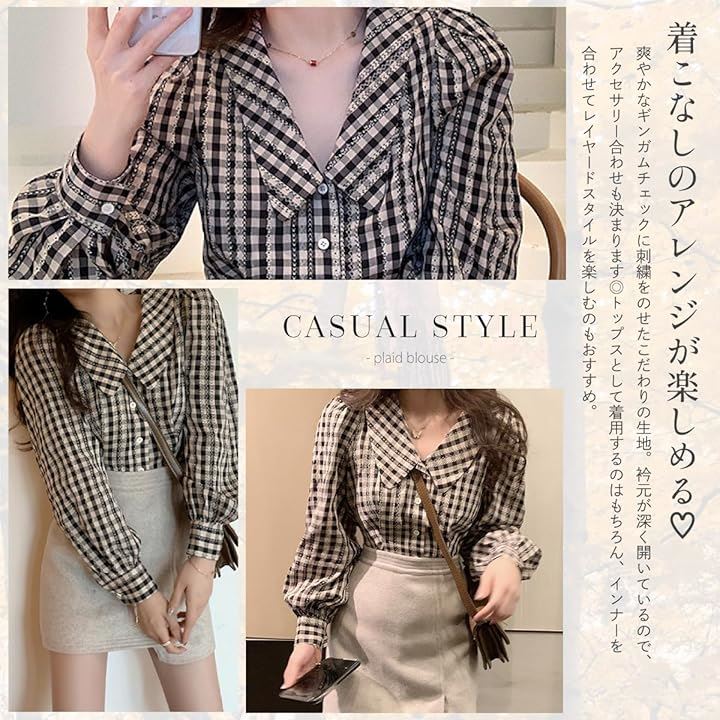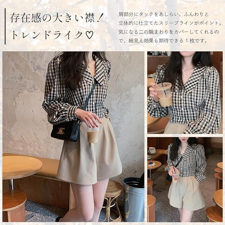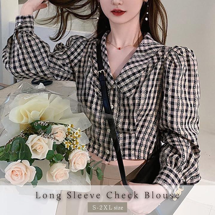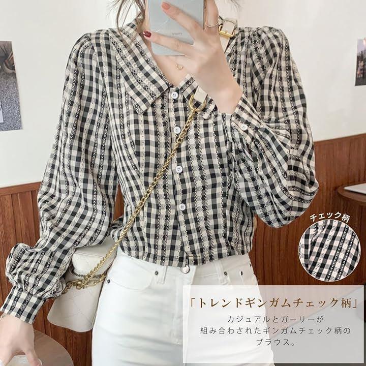 ウェアビー ショート丈 長袖チェックブラウス きれいめ シフォンシャツ 秋冬 レディース ビッグカラー ロングスリーブ ガーリー ギンガムチェック オータム ウインター キレイメ メリハリ リゾート 大人かわいい