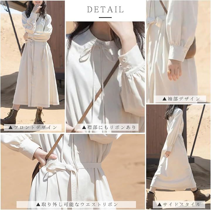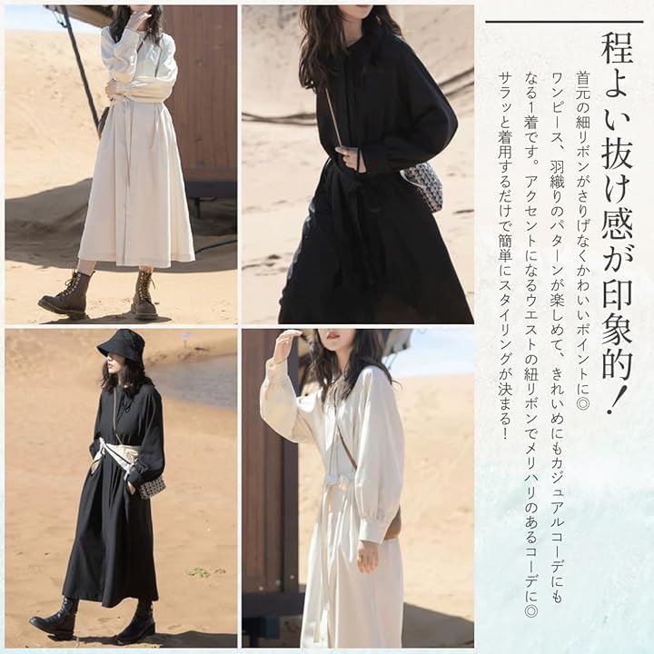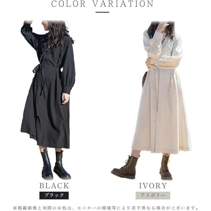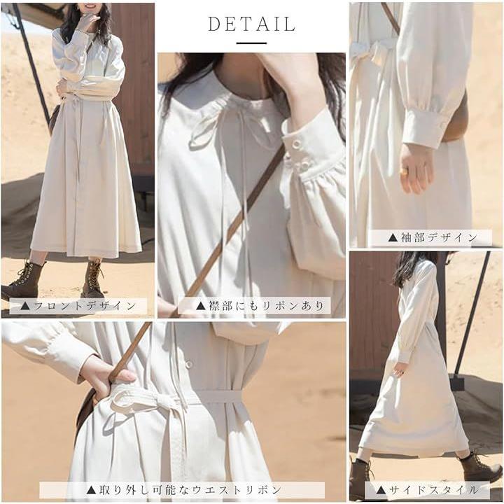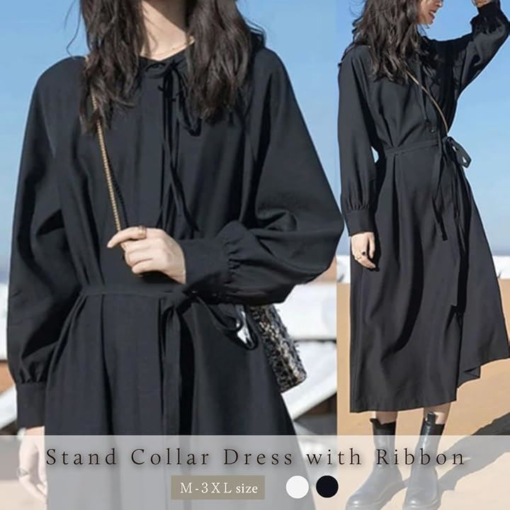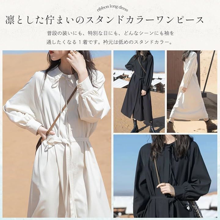 ウェアビー リボン付き スタンドカラー ワンピース ウエストマーク ロングワンピ 長袖 レディース パフスリーブ ロング丈 ミモレ丈 マキシ丈 かわいい ゆったり バンドカラー ナチュラル スマート aライン マーメイド