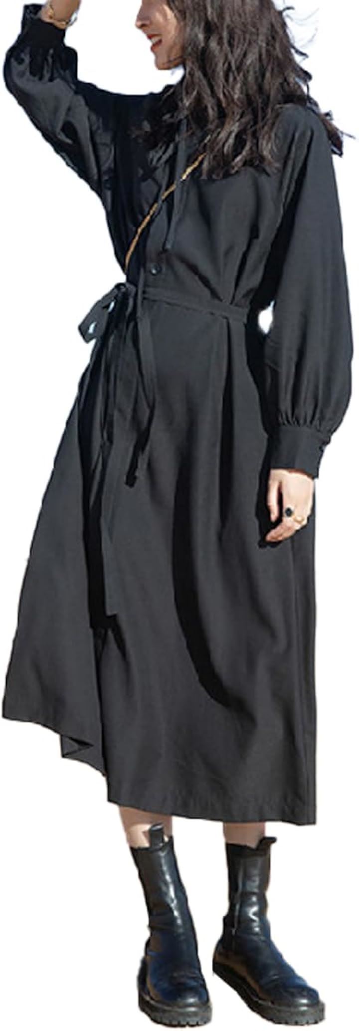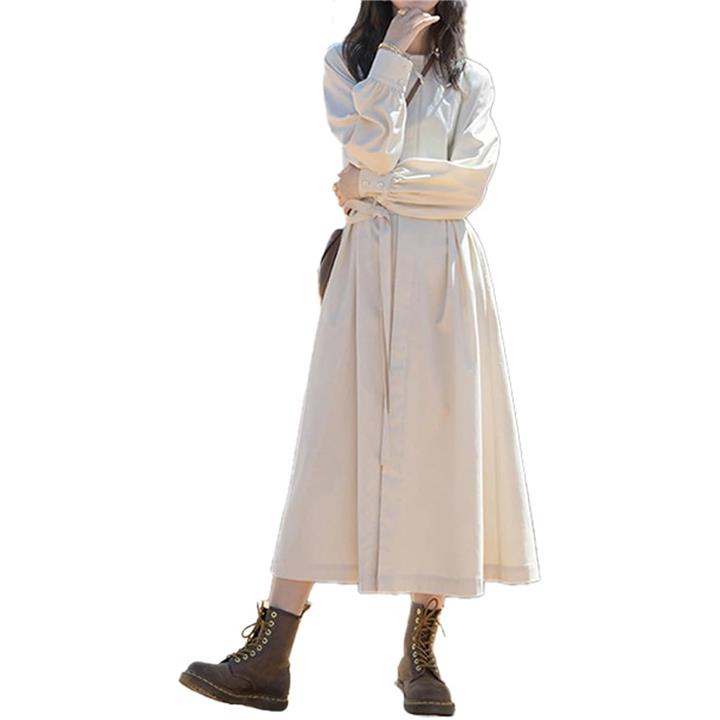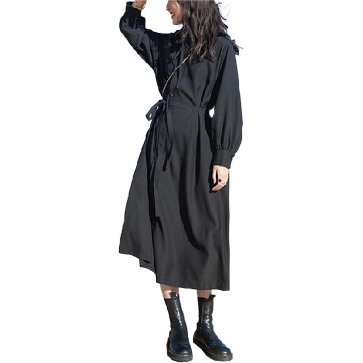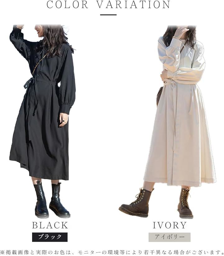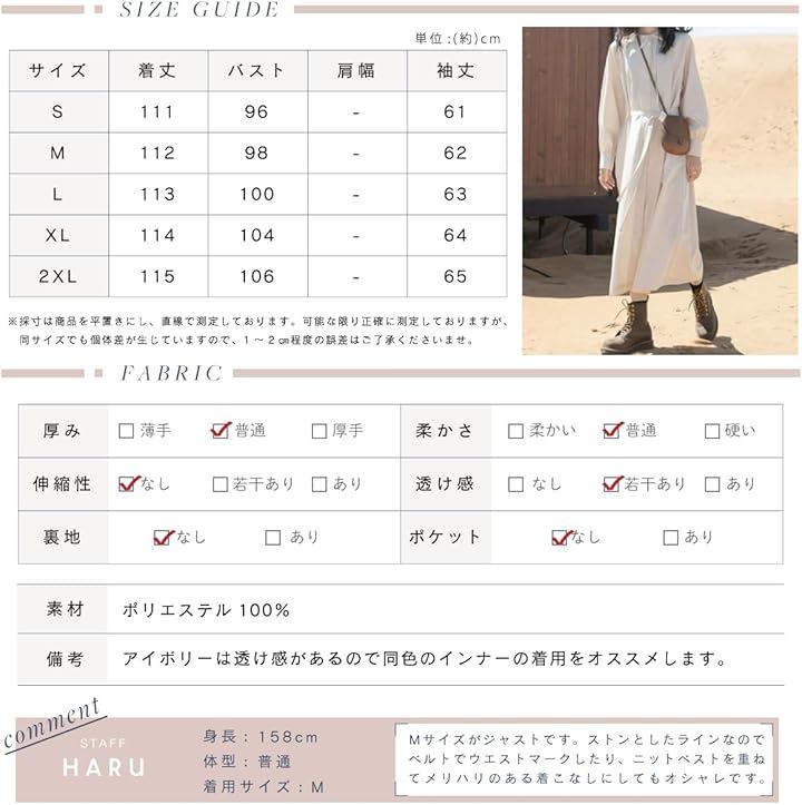 ウェアビー リボン付き スタンドカラー ワンピース ウエストマーク ロングワンピ 長袖 レディース パフスリーブ ロング丈 ミモレ丈 マキシ丈 かわいい ゆったり バンドカラー ナチュラル スマート aライン マーメイド